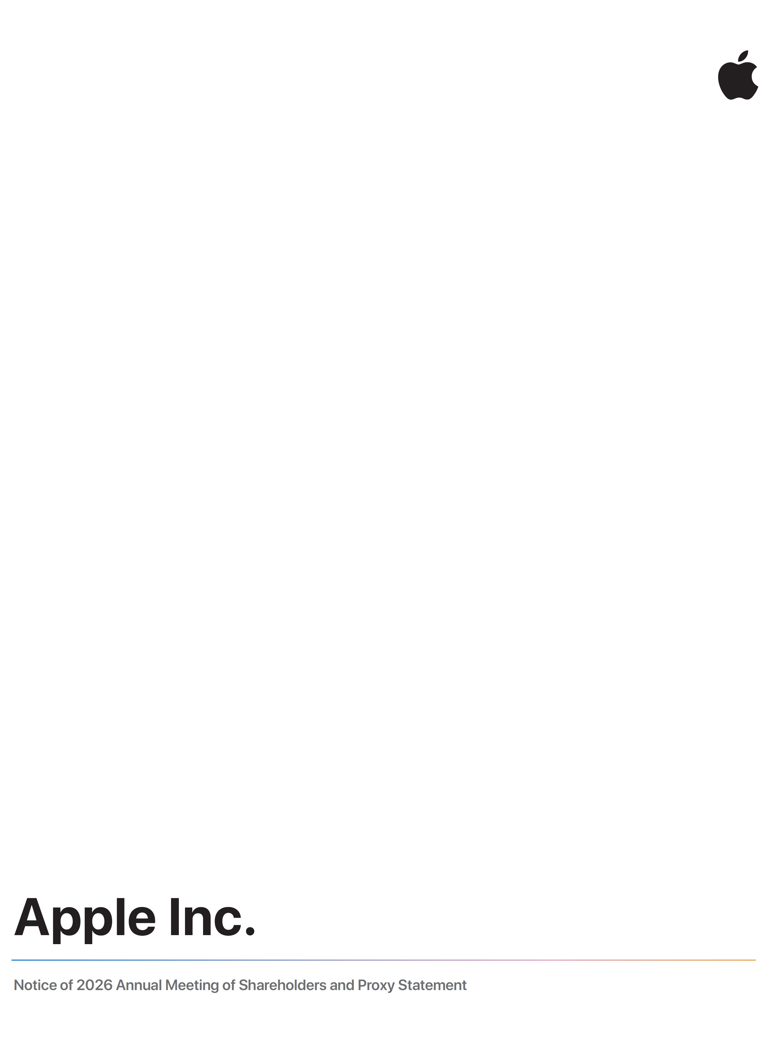 Important notice regarding the Availability of Proxy Materials for the Annual Meeting of Shareholders to be held on February 24, 2026. The Notice of Meeting, Proxy Statement, and Annual Report on Form 10-K are available free of charge at proxyvote.com and at investor.apple.com.