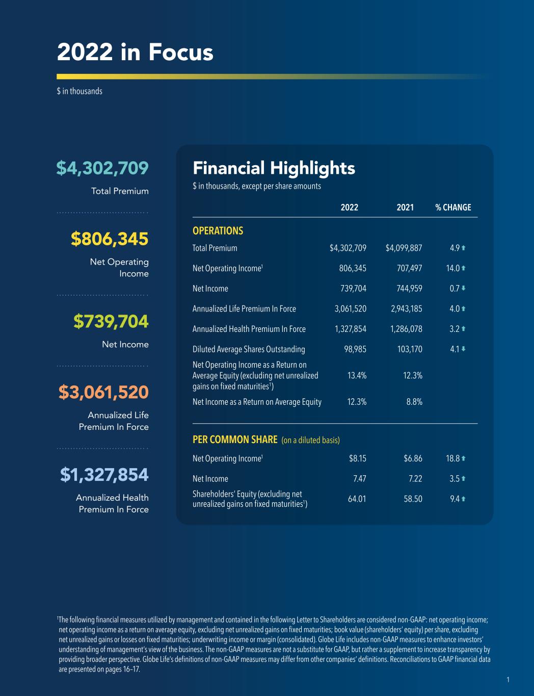 $ in thousands 1 The following financial measures utilized by management and contained in the following Letter to Shareholders are considered non-GAAP: net operating income; net operating income as a return on average equity, excluding net unrealized gains on fixed maturities; book value (shareholders’ equity) per share, excluding net unrealized gains or losses on fixed maturities; underwriting income or margin (consolidated). Globe Life includes non-GAAP measures to enhance investors’ understanding of management’s view of the business. The non-GAAP measures are not a substitute for GAAP, but rather a supplement to increase transparency by providing broader perspective. Globe Life’s definitions of non-GAAP measures may differ from other companies’ definitions. Reconciliations to GAAP financial data are presented on pages 16–17. $4,302,709 Total Premium $806,345 Net Operating Income $739,704 Net Income $3,061,520 Annualized Life Premium In Force $1,327,854 Annualized Health Premium In Force 2022 in Focus 1 Financial Highlights $ in thousands, except per share amounts 2022 2021 % CHANGE OPERATIONS Total Premium $4,302,709 $4,099,887 4.9 Net Operating Income1 806,345 707,497 14.0 Net Income 739,704 744,959 0.7 Annualized Life Premium In Force 3,061,520 2,943,185 4.0 Annualized Health Premium In Force 1,327,854 1,286,078 3.2 Diluted Average Shares Outstanding 98,985 103,170 4.1 Net Operating Income as a Return on Average Equity (excluding net unrealized gains on fixed maturities1) 13.4% 12.3% Net Income as a Return on Average Equity 12.3% 8.8% PER COMMON SHARE (on a diluted basis) Net Operating Income1 $8.15 $6.86 18.8 Net Income 7.47 7.22 3.5 Shareholders’ Equity (excluding net unrealized gains on fixed maturities1) 64.01 58.50 9.4