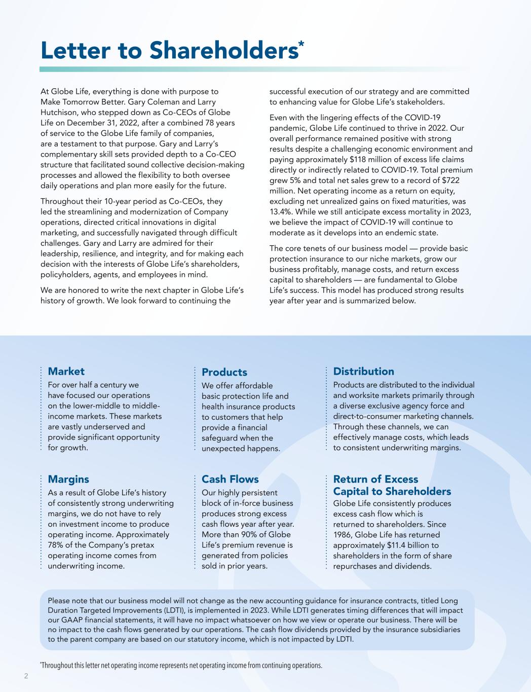 Products We offer affordable basic protection life and health insurance products to customers that help provide a financial safeguard when the unexpected happens. Market For over half a century we have focused our operations on the lower-middle to middle- income markets. These markets are vastly underserved and provide significant opportunity for growth. Margins As a result of Globe Life’s history of consistently strong underwriting margins, we do not have to rely on investment income to produce operating income. Approximately 78% of the Company’s pretax operating income comes from underwriting income. Distribution Products are distributed to the individual and worksite markets primarily through a diverse exclusive agency force and direct-to-consumer marketing channels. Through these channels, we can effectively manage costs, which leads to consistent underwriting margins. Return of Excess Capital to Shareholders Globe Life consistently produces excess cash flow which is returned to shareholders. Since 1986, Globe Life has returned approximately $11.4 billion to shareholders in the form of share repurchases and dividends. Cash Flows Our highly persistent block of in-force business produces strong excess cash flows year after year. More than 90% of Globe Life’s premium revenue is generated from policies sold in prior years. At Globe Life, everything is done with purpose to Make Tomorrow Better. Gary Coleman and Larry Hutchison, who stepped down as Co-CEOs of Globe Life on December 31, 2022, after a combined 78 years of service to the Globe Life family of companies, are a testament to that purpose. Gary and Larry’s complementary skill sets provided depth to a Co-CEO structure that facilitated sound collective decision-making processes and allowed the flexibility to both oversee daily operations and plan more easily for the future. Throughout their 10-year period as Co-CEOs, they led the streamlining and modernization of Company operations, directed critical innovations in digital marketing, and successfully navigated through difficult challenges. Gary and Larry are admired for their leadership, resilience, and integrity, and for making each decision with the interests of Globe Life’s shareholders, policyholders, agents, and employees in mind. We are honored to write the next chapter in Globe Life’s history of growth. We look forward to continuing the Please note that our business model will not change as the new accounting guidance for insurance contracts, titled Long Duration Targeted Improvements (LDTI), is implemented in 2023. While LDTI generates timing differences that will impact our GAAP financial statements, it will have no impact whatsoever on how we view or operate our business. There will be no impact to the cash flows generated by our operations. The cash flow dividends provided by the insurance subsidiaries to the parent company are based on our statutory income, which is not impacted by LDTI. Letter to Shareholders* *Throughout this letter net operating income represents net operating income from continuing operations. successful execution of our strategy and are committed to enhancing value for Globe Life’s stakeholders. Even with the lingering effects of the COVID-19 pandemic, Globe Life continued to thrive in 2022. Our overall performance remained positive with strong results despite a challenging economic environment and paying approximately $118 million of excess life claims directly or indirectly related to COVID-19. Total premium grew 5% and total net sales grew to a record of $722 million. Net operating income as a return on equity, excluding net unrealized gains on fixed maturities, was 13.4%. While we still anticipate excess mortality in 2023, we believe the impact of COVID-19 will continue to moderate as it develops into an endemic state. The core tenets of our business model — provide basic protection insurance to our niche markets, grow our business profitably, manage costs, and return excess capital to shareholders — are fundamental to Globe Life’s success. This model has produced strong results year after year and is summarized below. 2