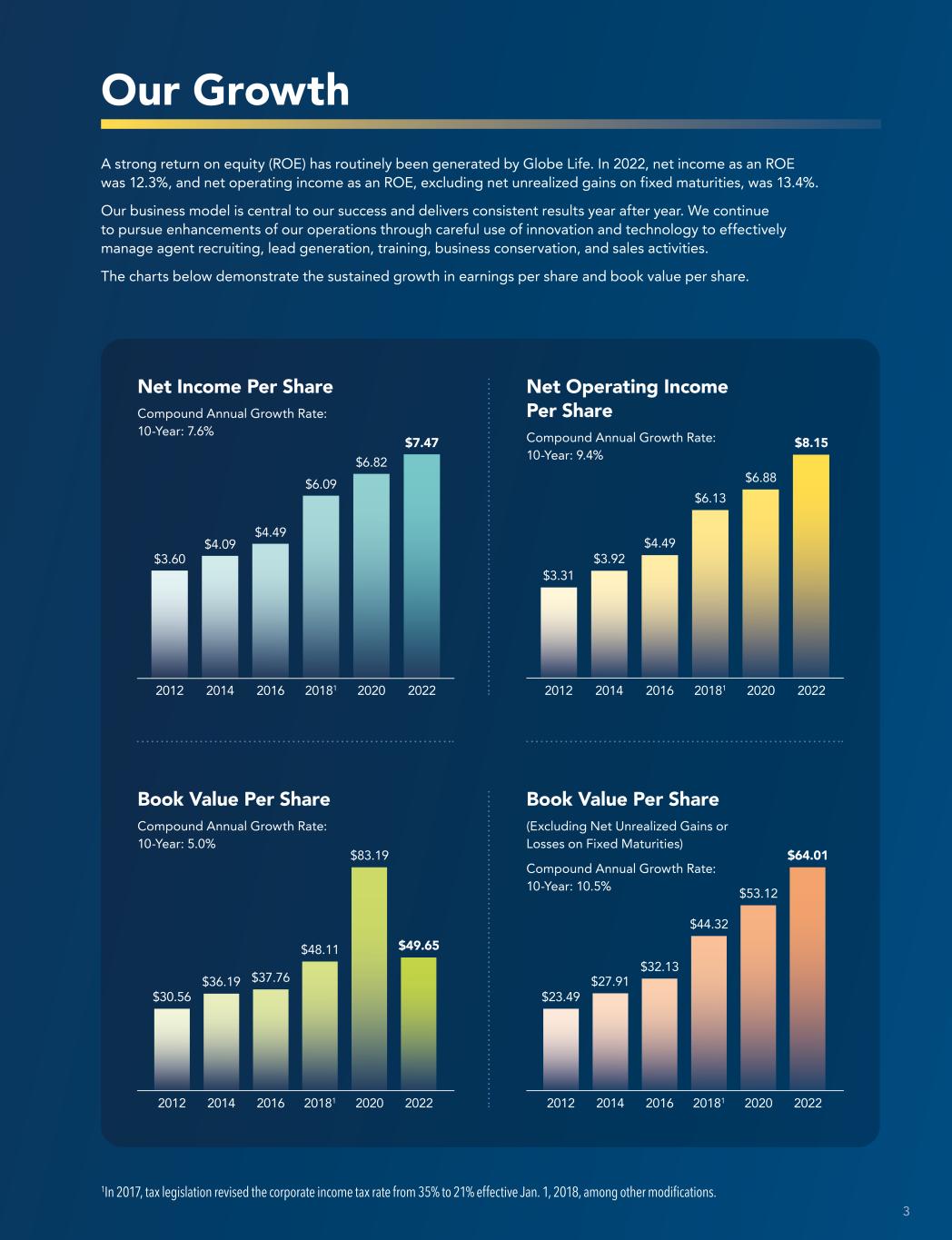 1In 2017, tax legislation revised the corporate income tax rate from 35% to 21% effective Jan. 1, 2018, among other modifications. A strong return on equity (ROE) has routinely been generated by Globe Life. In 2022, net income as an ROE was 12.3%, and net operating income as an ROE, excluding net unrealized gains on fixed maturities, was 13.4%. Our business model is central to our success and delivers consistent results year after year. We continue to pursue enhancements of our operations through careful use of innovation and technology to effectively manage agent recruiting, lead generation, training, business conservation, and sales activities. The charts below demonstrate the sustained growth in earnings per share and book value per share. Our Growth 2012 2014 2016 20181 20222020 $3.31 $3.92 $6.13 $4.49 $8.15 $6.88 Net Operating Income Per Share Compound Annual Growth Rate: 10-Year: 9.4% 2012 2014 2016 20181 20222020 $3.60 $4.09 $6.09 $4.49 $7.47 $6.82 Net Income Per Share Compound Annual Growth Rate: 10-Year: 7.6% 2012 2014 2016 20181 20222020 $30.56 $36.19 $48.11 $37.76 $49.65 $83.19 Book Value Per Share Compound Annual Growth Rate: 10-Year: 5.0% 2012 2014 2016 20181 20222020 $23.49 $27.91 $44.32 $32.13 $64.01 $53.12 Book Value Per Share (Excluding Net Unrealized Gains or Losses on Fixed Maturities) Compound Annual Growth Rate: 10-Year: 10.5% 3