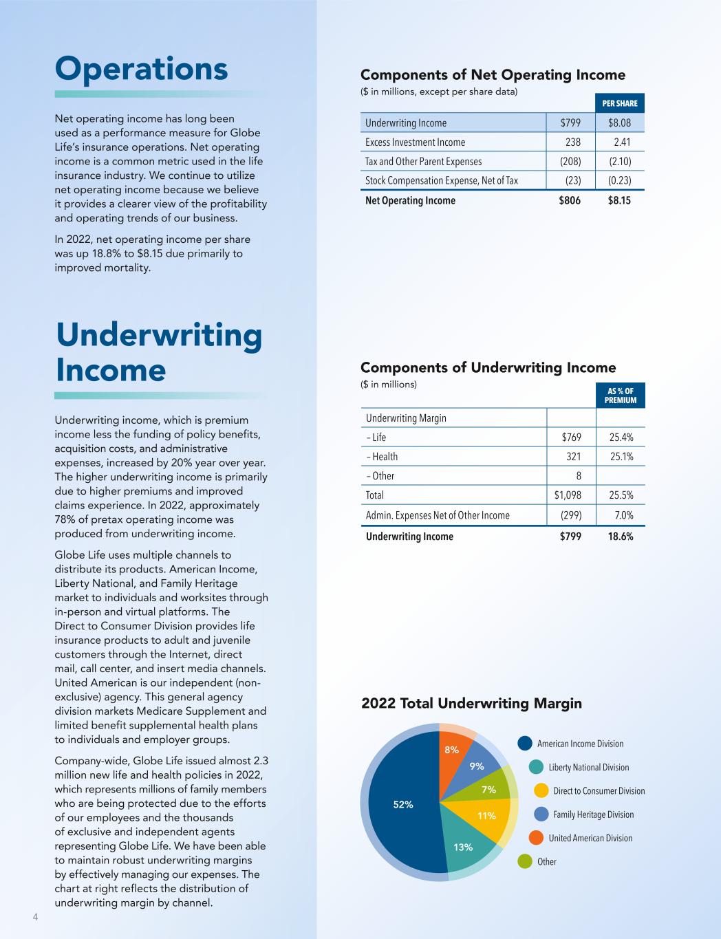 PER SHARE Underwriting Income $799 $8.08 Excess Investment Income 238 2.41 Tax and Other Parent Expenses (208) (2.10) Stock Compensation Expense, Net of Tax (23) (0.23) Net Operating Income $806 $8.15 Components of Net Operating Income ($ in millions, except per share data) Components of Underwriting Income ($ in millions) AS % OF PREMIUM Underwriting Margin – Life $769 25.4% – Health 321 25.1% – Other 8 Total $1,098 25.5% Admin. Expenses Net of Other Income (299) 7.0% Underwriting Income $799 18.6% Net operating income has long been used as a performance measure for Globe Life’s insurance operations. Net operating income is a common metric used in the life insurance industry. We continue to utilize net operating income because we believe it provides a clearer view of the profitability and operating trends of our business. In 2022, net operating income per share was up 18.8% to $8.15 due primarily to improved mortality. Underwriting income, which is premium income less the funding of policy benefits, acquisition costs, and administrative expenses, increased by 20% year over year. The higher underwriting income is primarily due to higher premiums and improved claims experience. In 2022, approximately 78% of pretax operating income was produced from underwriting income. Globe Life uses multiple channels to distribute its products. American Income, Liberty National, and Family Heritage market to individuals and worksites through in-person and virtual platforms. The Direct to Consumer Division provides life insurance products to adult and juvenile customers through the Internet, direct mail, call center, and insert media channels. United American is our independent (non- exclusive) agency. This general agency division markets Medicare Supplement and limited benefit supplemental health plans to individuals and employer groups. Company-wide, Globe Life issued almost 2.3 million new life and health policies in 2022, which represents millions of family members who are being protected due to the efforts of our employees and the thousands of exclusive and independent agents representing Globe Life. We have been able to maintain robust underwriting margins by effectively managing our expenses. The chart at right reflects the distribution of underwriting margin by channel. Underwriting Income Operations 2022 Total Underwriting Margin American Income Division Liberty National Division Direct to Consumer Division Family Heritage Division United American Division Other 52% 8% 9% 7% 13% 11% 4