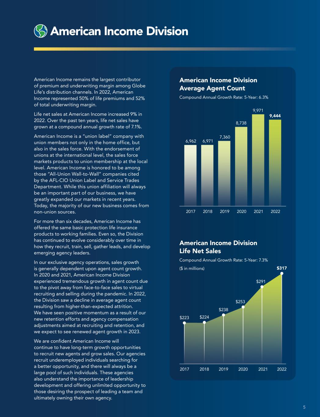 American Income remains the largest contributor of premium and underwriting margin among Globe Life’s distribution channels. In 2022, American Income represented 50% of life premiums and 52% of total underwriting margin. Life net sales at American Income increased 9% in 2022. Over the past ten years, life net sales have grown at a compound annual growth rate of 7.1%. American Income is a “union label” company with union members not only in the home office, but also in the sales force. With the endorsement of unions at the international level, the sales force markets products to union membership at the local level. American Income is honored to be among those “All-Union Wall-to-Wall” companies cited by the AFL-CIO Union Label and Service Trades Department. While this union affiliation will always be an important part of our business, we have greatly expanded our markets in recent years. Today, the majority of our new business comes from non-union sources. For more than six decades, American Income has offered the same basic protection life insurance products to working families. Even so, the Division has continued to evolve considerably over time in how they recruit, train, sell, gather leads, and develop emerging agency leaders. In our exclusive agency operations, sales growth is generally dependent upon agent count growth. In 2020 and 2021, American Income Division experienced tremendous growth in agent count due to the pivot away from face-to-face sales to virtual recruiting and selling during the pandemic. In 2022, the Division saw a decline in average agent count resulting from higher-than-expected attrition. We have seen positive momentum as a result of our new retention efforts and agency compensation adjustments aimed at recruiting and retention, and we expect to see renewed agent growth in 2023. We are confident American Income will continue to have long-term growth opportunities to recruit new agents and grow sales. Our agencies recruit underemployed individuals searching for a better opportunity, and there will always be a large pool of such individuals. These agencies also understand the importance of leadership development and offering unlimited opportunity to those desiring the prospect of leading a team and ultimately owning their own agency. 6,962 6,971 7,360 8,738 9,971 9,444 2017 2018 2019 2020 2021 2022 American Income Division Average Agent Count Compound Annual Growth Rate: 5-Year: 6.3% $223 $224 $238 $253 $291 $317 2017 2018 2019 2020 2021 2022 American Income Division Life Net Sales Compound Annual Growth Rate: 5-Year: 7.3% ($ in millions) 5
