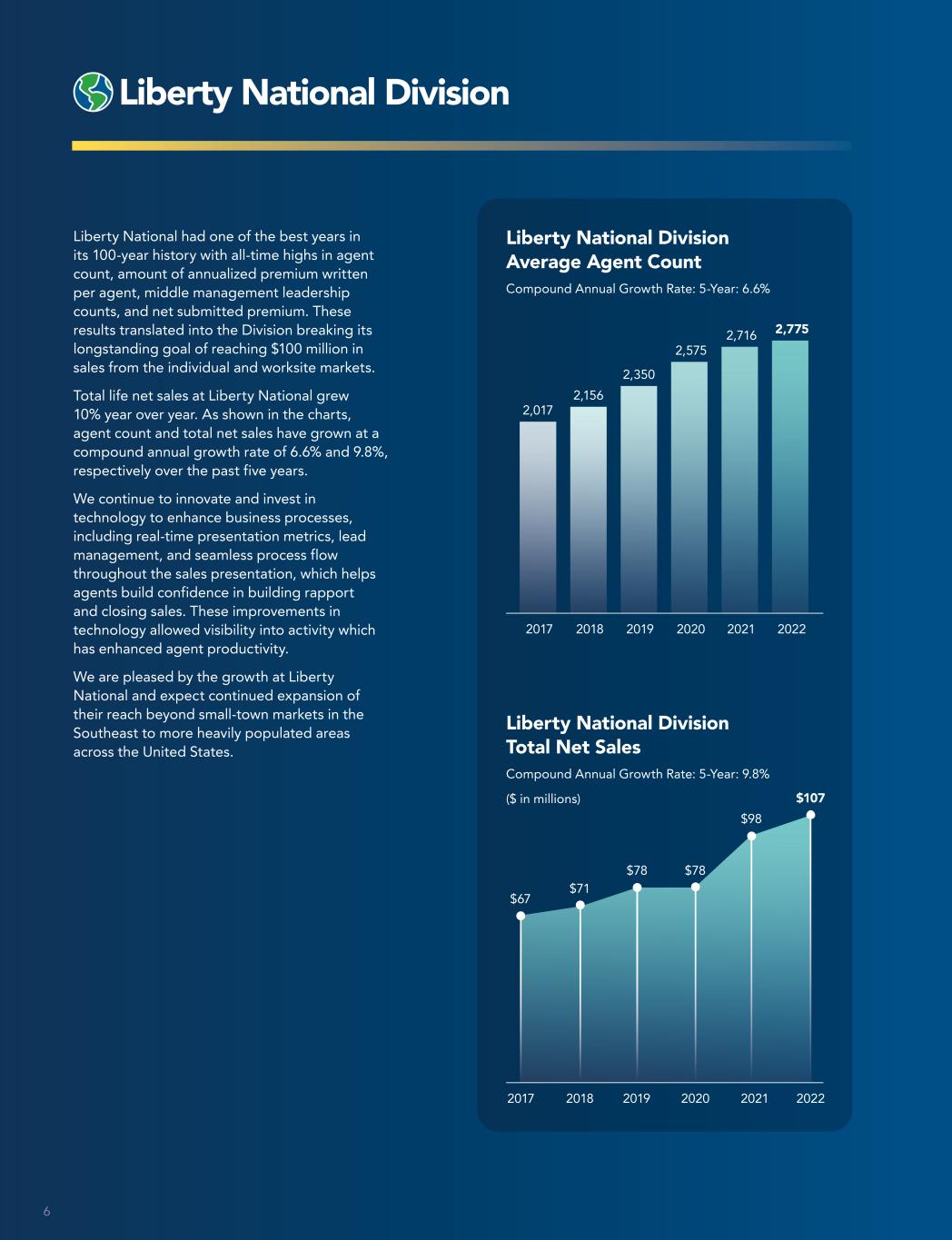 Liberty National had one of the best years in its 100-year history with all-time highs in agent count, amount of annualized premium written per agent, middle management leadership counts, and net submitted premium. These results translated into the Division breaking its longstanding goal of reaching $100 million in sales from the individual and worksite markets. Total life net sales at Liberty National grew 10% year over year. As shown in the charts, agent count and total net sales have grown at a compound annual growth rate of 6.6% and 9.8%, respectively over the past five years. We continue to innovate and invest in technology to enhance business processes, including real-time presentation metrics, lead management, and seamless process flow throughout the sales presentation, which helps agents build confidence in building rapport and closing sales. These improvements in technology allowed visibility into activity which has enhanced agent productivity. We are pleased by the growth at Liberty National and expect continued expansion of their reach beyond small-town markets in the Southeast to more heavily populated areas across the United States. 2,017 2,156 2,350 2,575 2,716 2,775 2017 2018 2019 2020 2021 2022 Liberty National Division Average Agent Count Compound Annual Growth Rate: 5-Year: 6.6% Liberty National Division Total Net Sales Compound Annual Growth Rate: 5-Year: 9.8% ($ in millions) 2017 2018 2019 2020 2021 2022 $67 $71 $78 $78 $98 $107 6