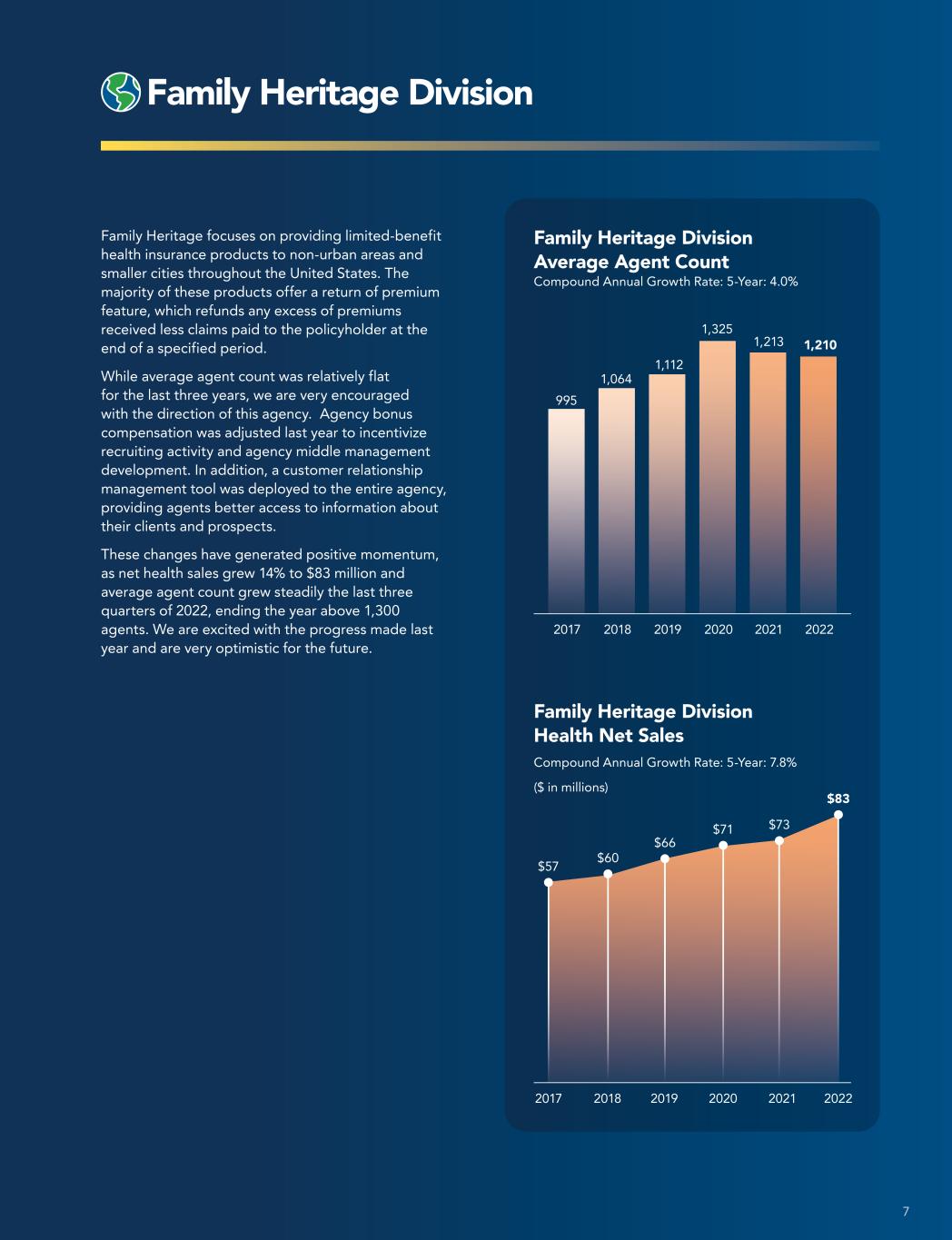 Family Heritage focuses on providing limited-benefit health insurance products to non-urban areas and smaller cities throughout the United States. The majority of these products offer a return of premium feature, which refunds any excess of premiums received less claims paid to the policyholder at the end of a specified period. While average agent count was relatively flat for the last three years, we are very encouraged with the direction of this agency. Agency bonus compensation was adjusted last year to incentivize recruiting activity and agency middle management development. In addition, a customer relationship management tool was deployed to the entire agency, providing agents better access to information about their clients and prospects. These changes have generated positive momentum, as net health sales grew 14% to $83 million and average agent count grew steadily the last three quarters of 2022, ending the year above 1,300 agents. We are excited with the progress made last year and are very optimistic for the future. Family Heritage Division Health Net Sales Compound Annual Growth Rate: 5-Year: 7.8% ($ in millions) 995 1,064 1,112 1,325 1,213 1,210 2017 2018 2019 2020 2021 2022 Family Heritage Division Average Agent Count Compound Annual Growth Rate: 5-Year: 4.0% 2017 2018 2019 2020 2021 2022 $57 $60 $66 $71 $73 $83 7