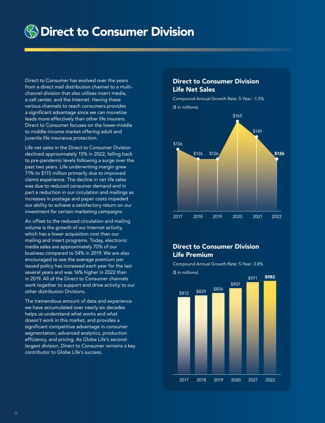 Direct to Consumer has evolved over the years from a direct mail distribution channel to a multi- channel division that also utilizes insert media, a call center, and the Internet. Having these various channels to reach consumers provides a significant advantage since we can monetize leads more effectively than other life insurers. Direct to Consumer focuses on the lower-middle to middle-income market offering adult and juvenile life insurance protection. Life net sales in the Direct to Consumer Division declined approximately 15% in 2022, falling back to pre-pandemic levels following a surge over the past two years. Life underwriting margin grew 71% to $115 million primarily due to improved claims experience. The decline in net life sales was due to reduced consumer demand and in part a reduction in our circulation and mailings as increases in postage and paper costs impeded our ability to achieve a satisfactory return on our investment for certain marketing campaigns. An offset to the reduced circulation and mailing volume is the growth of our Internet activity, which has a lower acquisition cost than our mailing and insert programs. Today, electronic media sales are approximately 70% of our business compared to 54% in 2019. We are also encouraged to see the average premium per issued policy has increased each year for the last several years and was 16% higher in 2022 than in 2019. All of the Direct to Consumer channels work together to support and drive activity to our other distribution Divisions. The tremendous amount of data and experience we have accumulated over nearly six decades helps us understand what works and what doesn’t work in this market, and provides a significant competitive advantage in consumer segmentation, advanced analytics, production efficiency, and pricing. As Globe Life’s second- largest division, Direct to Consumer remains a key contributor to Globe Life’s success. Direct to Consumer Division Life Net Sales Compound Annual Growth Rate: 5-Year: -1.5% ($ in millions) 2017 2018 2019 2020 2021 2022 $136 $126 $126 $165 $149 $126 Direct to Consumer Division Life Premium Compound Annual Growth Rate: 5-Year: 3.8% ($ in millions) 2017 2018 2019 2020 2021 2022 $813 $829 $856 $907 $971 $982 8
