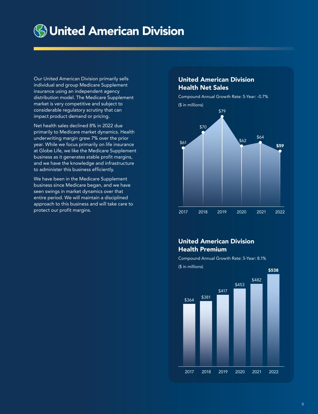 Our United American Division primarily sells individual and group Medicare Supplement insurance using an independent agency distribution model. The Medicare Supplement market is very competitive and subject to considerable regulatory scrutiny that can impact product demand or pricing. Net health sales declined 8% in 2022 due primarily to Medicare market dynamics. Health underwriting margin grew 7% over the prior year. While we focus primarily on life insurance at Globe Life, we like the Medicare Supplement business as it generates stable profit margins, and we have the knowledge and infrastructure to administer this business efficiently. We have been in the Medicare Supplement business since Medicare began, and we have seen swings in market dynamics over that entire period. We will maintain a disciplined approach to this business and will take care to protect our profit margins. United American Division Health Net Sales Compound Annual Growth Rate: 5-Year: -0.7% ($ in millions) 2017 2018 2019 2020 2021 2022 $61 $70 $79 $62 $64 $59 United American Division Health Premium Compound Annual Growth Rate: 5-Year: 8.1% ($ in millions) 2017 2018 2019 2020 2021 2022 $364 $381 $417 $453 $482 $538 9