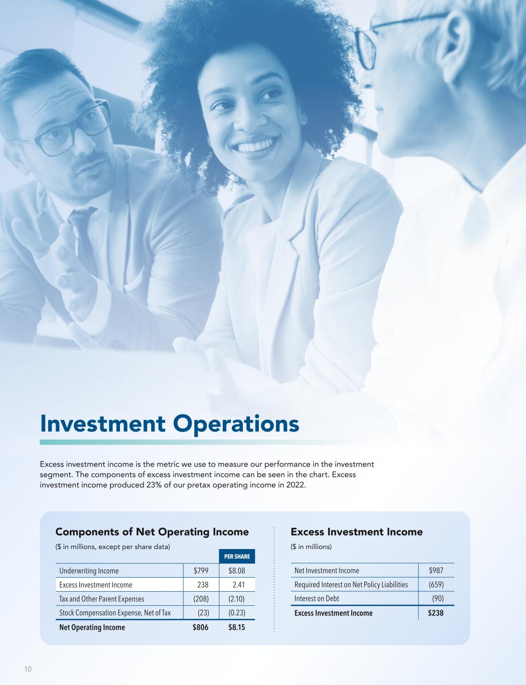 Components of Net Operating Income ($ in millions, except per share data) PER SHARE Underwriting Income $799 $8.08 Excess Investment Income 238 2.41 Tax and Other Parent Expenses (208) (2.10) Stock Compensation Expense, Net of Tax (23) (0.23) Net Operating Income $806 $8.15 Excess Investment Income ($ in millions) Net Investment Income $987 Required Interest on Net Policy Liabilities (659) Interest on Debt (90) Excess Investment Income $238 Excess investment income is the metric we use to measure our performance in the investment segment. The components of excess investment income can be seen in the chart. Excess investment income produced 23% of our pretax operating income in 2022. Investment Operations 10