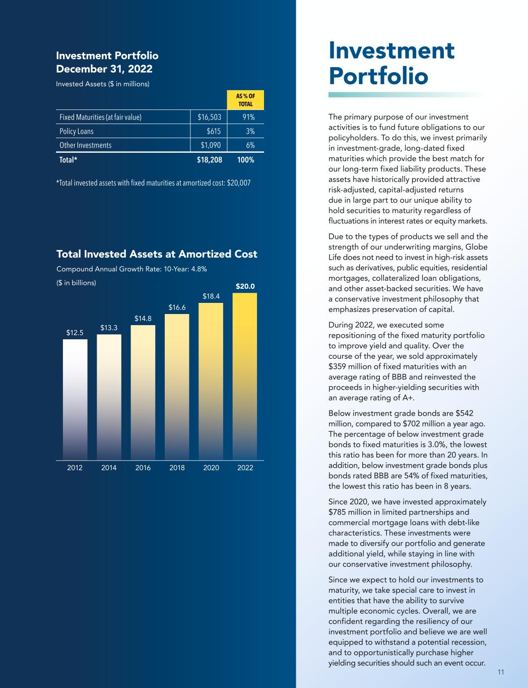 The primary purpose of our investment activities is to fund future obligations to our policyholders. To do this, we invest primarily in investment-grade, long-dated fixed maturities which provide the best match for our long-term fixed liability products. These assets have historically provided attractive risk-adjusted, capital-adjusted returns due in large part to our unique ability to hold securities to maturity regardless of fluctuations in interest rates or equity markets. Due to the types of products we sell and the strength of our underwriting margins, Globe Life does not need to invest in high-risk assets such as derivatives, public equities, residential mortgages, collateralized loan obligations, and other asset-backed securities. We have a conservative investment philosophy that emphasizes preservation of capital. During 2022, we executed some repositioning of the fixed maturity portfolio to improve yield and quality. Over the course of the year, we sold approximately $359 million of fixed maturities with an average rating of BBB and reinvested the proceeds in higher-yielding securities with an average rating of A+. Below investment grade bonds are $542 million, compared to $702 million a year ago. The percentage of below investment grade bonds to fixed maturities is 3.0%, the lowest this ratio has been for more than 20 years. In addition, below investment grade bonds plus bonds rated BBB are 54% of fixed maturities, the lowest this ratio has been in 8 years. Since 2020, we have invested approximately $785 million in limited partnerships and commercial mortgage loans with debt-like characteristics. These investments were made to diversify our portfolio and generate additional yield, while staying in line with our conservative investment philosophy. Since we expect to hold our investments to maturity, we take special care to invest in entities that have the ability to survive multiple economic cycles. Overall, we are confident regarding the resiliency of our investment portfolio and believe we are well equipped to withstand a potential recession, and to opportunistically purchase higher yielding securities should such an event occur. Investment Portfolio Total Invested Assets at Amortized Cost Compound Annual Growth Rate: 10-Year: 4.8% ($ in billions) 2012 2014 2016 2018 20222020 $12.5 $13.3 $16.6 $14.8 $20.0 $18.4 AS % OF TOTAL Fixed Maturities (at fair value) $16,503 91% Policy Loans $615 3% Other Investments $1,090 6% Total* $18,208 100% *Total invested assets with fixed maturities at amortized cost: $20,007 Investment Portfolio December 31, 2022 Invested Assets ($ in millions) 11