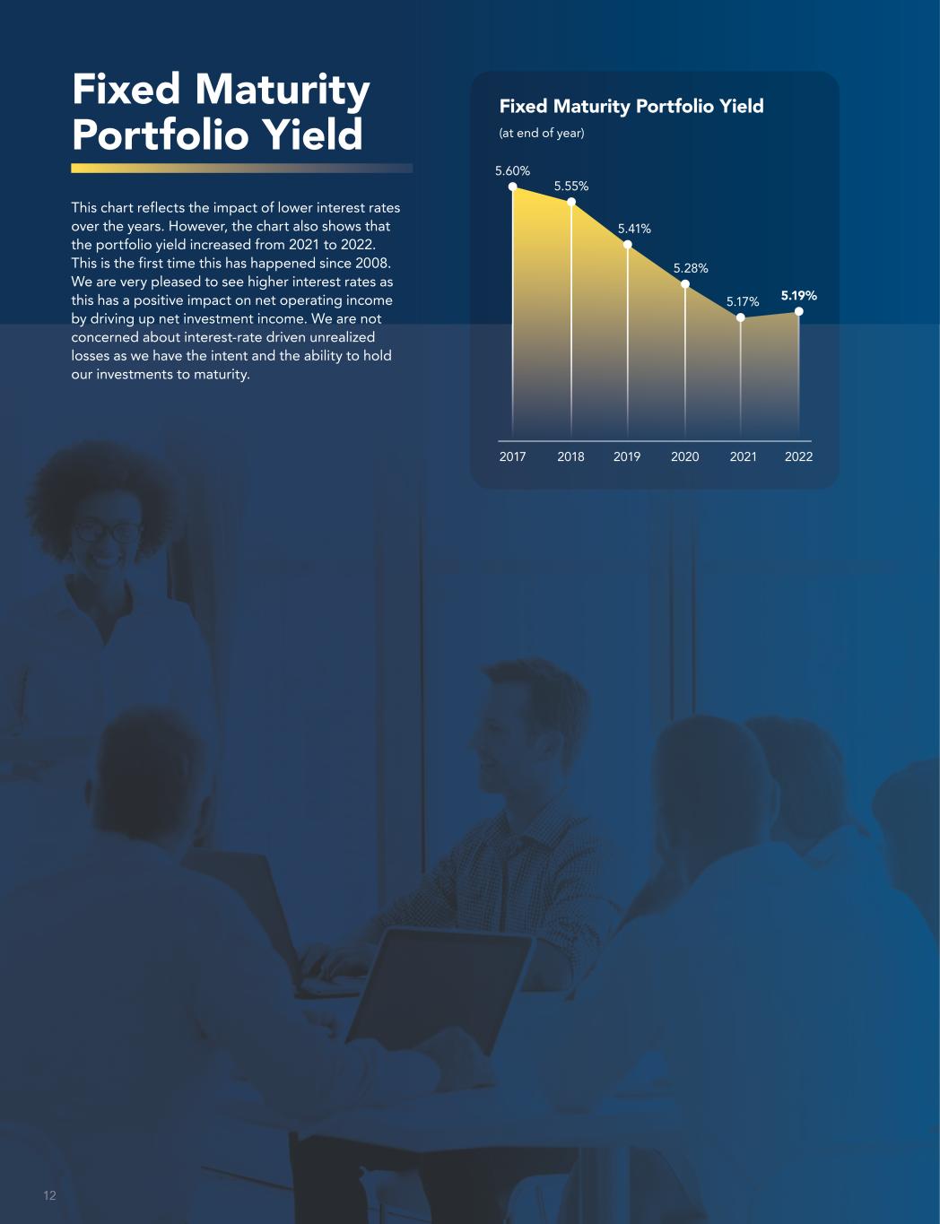 This chart reflects the impact of lower interest rates over the years. However, the chart also shows that the portfolio yield increased from 2021 to 2022. This is the first time this has happened since 2008. We are very pleased to see higher interest rates as this has a positive impact on net operating income by driving up net investment income. We are not concerned about interest-rate driven unrealized losses as we have the intent and the ability to hold our investments to maturity. Fixed Maturity Portfolio Yield Fixed Maturity Portfolio Yield (at end of year) 5.55% 5.60% 5.41% 5.28% 5.17% 5.19% 2017 2018 2019 2020 2021 2022 12