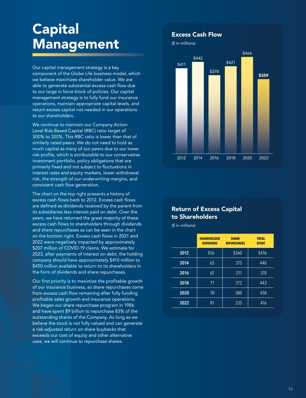 SHAREHOLDER DIVIDENDS SHARE REPURCHASES TOTAL SPENT 2012 $56 $360 $416 2014 65 375 440 2016 67 311 378 2018 71 372 443 2020 78 380 458 2022 81 335 416 Return of Excess Capital to Shareholders ($ in millions) Our capital management strategy is a key component of the Globe Life business model, which we believe maximizes shareholder value. We are able to generate substantial excess cash flow due to our large in force block of policies. Our capital management strategy is to fully fund our insurance operations, maintain appropriate capital levels, and return excess capital not needed in our operations to our shareholders. We continue to maintain our Company Action Level Risk-Based Capital (RBC) ratio target of 300% to 320%. This RBC ratio is lower than that of similarly rated peers. We do not need to hold as much capital as many of our peers due to our lower risk profile, which is attributable to our conservative investment portfolio, policy obligations that are primarily fixed and not subject to fluctuations in interest rates and equity markets, lower withdrawal risk, the strength of our underwriting margins, and consistent cash flow generation. The chart on the top right presents a history of excess cash flows back to 2012. Excess cash flows are defined as dividends received by the parent from its subsidiaries less interest paid on debt. Over the years, we have returned the great majority of these excess cash flows to shareholders through dividends and share repurchases as can be seen in the chart on the bottom right. Excess cash flows in 2021 and 2022 were negatively impacted by approximately $207 million of COVID-19 claims. We estimate for 2023, after payments of interest on debt, the holding company should have approximately $410 million to $450 million available to return to its shareholders in the form of dividends and share repurchases. Our first priority is to maximize the profitable growth of our insurance business, so share repurchases come from excess cash flow remaining after fully funding profitable sales growth and insurance operations. We began our share repurchase program in 1986 and have spent $9 billion to repurchase 83% of the outstanding shares of the Company. As long as we believe the stock is not fully valued and can generate a risk-adjusted return on share buybacks that exceeds our cost of equity and other alternative uses, we will continue to repurchase shares. Capital Management Excess Cash Flow ($ in millions) 2012 2014 2016 2018 20222020 $411 $442 $421 $378 $359 $466 13