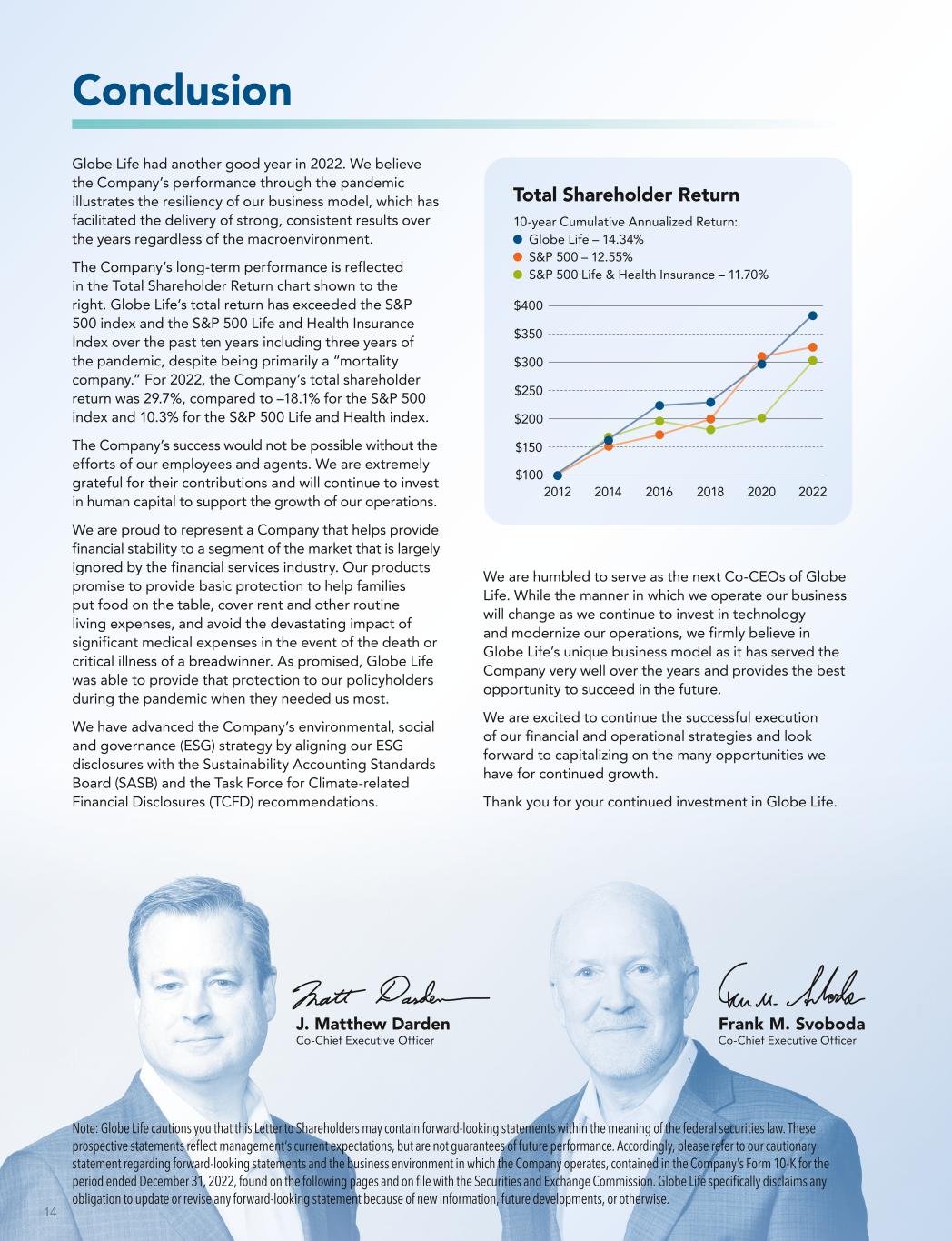 Total Shareholder Return 10-year Cumulative Annualized Return: Globe Life – 14.34% S&P 500 – 12.55% S&P 500 Life & Health Insurance – 11.70% 2012 2014 2016 2018 2020 2022 $150 $200 $250 $300 $350 $400 $100 Frank M. Svoboda Co-Chief Executive Officer J. Matthew Darden Co-Chief Executive Officer Note: Globe Life cautions you that this Letter to Shareholders may contain forward-looking statements within the meaning of the federal securities law. These prospective statements reflect management’s current expectations, but are not guarantees of future performance. Accordingly, please refer to our cautionary statement regarding forward-looking statements and the business environment in which the Company operates, contained in the Company’s Form 10-K for the period ended December 31, 2022, found on the following pages and on file with the Securities and Exchange Commission. Globe Life specifically disclaims any obligation to update or revise any forward-looking statement because of new information, future developments, or otherwise. Globe Life had another good year in 2022. We believe the Company’s performance through the pandemic illustrates the resiliency of our business model, which has facilitated the delivery of strong, consistent results over the years regardless of the macroenvironment. The Company’s long-term performance is reflected in the Total Shareholder Return chart shown to the right. Globe Life’s total return has exceeded the S&P 500 index and the S&P 500 Life and Health Insurance Index over the past ten years including three years of the pandemic, despite being primarily a “mortality company.” For 2022, the Company’s total shareholder return was 29.7%, compared to –18.1% for the S&P 500 index and 10.3% for the S&P 500 Life and Health index. The Company’s success would not be possible without the efforts of our employees and agents. We are extremely grateful for their contributions and will continue to invest in human capital to support the growth of our operations. We are proud to represent a Company that helps provide financial stability to a segment of the market that is largely ignored by the financial services industry. Our products promise to provide basic protection to help families put food on the table, cover rent and other routine living expenses, and avoid the devastating impact of significant medical expenses in the event of the death or critical illness of a breadwinner. As promised, Globe Life was able to provide that protection to our policyholders during the pandemic when they needed us most. We have advanced the Company’s environmental, social and governance (ESG) strategy by aligning our ESG disclosures with the Sustainability Accounting Standards Board (SASB) and the Task Force for Climate-related Financial Disclosures (TCFD) recommendations. We are humbled to serve as the next Co-CEOs of Globe Life. While the manner in which we operate our business will change as we continue to invest in technology and modernize our operations, we firmly believe in Globe Life’s unique business model as it has served the Company very well over the years and provides the best opportunity to succeed in the future. We are excited to continue the successful execution of our financial and operational strategies and look forward to capitalizing on the many opportunities we have for continued growth. Thank you for your continued investment in Globe Life. Conclusion 14