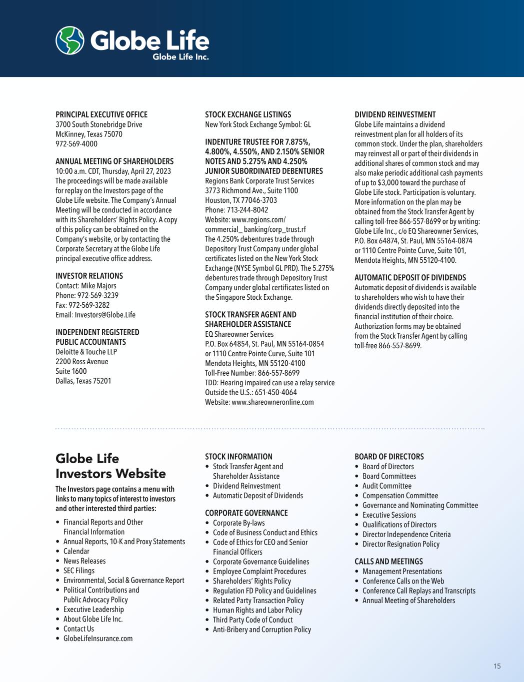 PRINCIPAL EXECUTIVE OFFICE 3700 South Stonebridge Drive McKinney, Texas 75070 972-569-4000 ANNUAL MEETING OF SHAREHOLDERS 10:00 a.m. CDT, Thursday, April 27, 2023 The proceedings will be made available for replay on the Investors page of the Globe Life website. The Company’s Annual Meeting will be conducted in accordance with its Shareholders’ Rights Policy. A copy of this policy can be obtained on the Company’s website, or by contacting the Corporate Secretary at the Globe Life principal executive office address. INVESTOR RELATIONS Contact: Mike Majors Phone: 972-569-3239 Fax: 972-569-3282 Email: Investors@Globe.Life INDEPENDENT REGISTERED PUBLIC ACCOUNTANTS Deloitte & Touche LLP 2200 Ross Avenue Suite 1600 Dallas, Texas 75201 STOCK EXCHANGE LISTINGS New York Stock Exchange Symbol: GL INDENTURE TRUSTEE FOR 7.875%, 4.800%, 4.550%, AND 2.150% SENIOR NOTES AND 5.275% AND 4.250% JUNIOR SUBORDINATED DEBENTURES Regions Bank Corporate Trust Services 3773 Richmond Ave., Suite 1100 Houston, TX 77046-3703 Phone: 713-244-8042 Website: www.regions.com/ commercial_ banking/corp_trust.rf The 4.250% debentures trade through Depository Trust Company under global certificates listed on the New York Stock Exchange (NYSE Symbol GL PRD). The 5.275% debentures trade through Depository Trust Company under global certificates listed on the Singapore Stock Exchange. STOCK TRANSFER AGENT AND SHAREHOLDER ASSISTANCE EQ Shareowner Services P.O. Box 64854, St. Paul, MN 55164-0854 or 1110 Centre Pointe Curve, Suite 101 Mendota Heights, MN 55120-4100 Toll-Free Number: 866-557-8699 TDD: Hearing impaired can use a relay service Outside the U.S.: 651-450-4064 Website: www.shareowneronline.com DIVIDEND REINVESTMENT Globe Life maintains a dividend reinvestment plan for all holders of its common stock. Under the plan, shareholders may reinvest all or part of their dividends in additional shares of common stock and may also make periodic additional cash payments of up to $3,000 toward the purchase of Globe Life stock. Participation is voluntary. More information on the plan may be obtained from the Stock Transfer Agent by calling toll-free 866-557-8699 or by writing: Globe Life Inc., c/o EQ Shareowner Services, P.O. Box 64874, St. Paul, MN 55164-0874 or 1110 Centre Pointe Curve, Suite 101, Mendota Heights, MN 55120-4100. AUTOMATIC DEPOSIT OF DIVIDENDS Automatic deposit of dividends is available to shareholders who wish to have their dividends directly deposited into the financial institution of their choice. Authorization forms may be obtained from the Stock Transfer Agent by calling toll-free 866-557-8699. Globe Life Investors Website The Investors page contains a menu with links to many topics of interest to investors and other interested third parties: • Financial Reports and Other Financial Information • Annual Reports, 10-K and Proxy Statements • Calendar • News Releases • SEC Filings • Environmental, Social & Governance Report • Political Contributions and Public Advocacy Policy • Executive Leadership • About Globe Life Inc. • Contact Us • GlobeLifeInsurance.com STOCK INFORMATION • Stock Transfer Agent and Shareholder Assistance • Dividend Reinvestment • Automatic Deposit of Dividends CORPORATE GOVERNANCE • Corporate By-laws • Code of Business Conduct and Ethics • Code of Ethics for CEO and Senior Financial Officers • Corporate Governance Guidelines • Employee Complaint Procedures • Shareholders’ Rights Policy • Regulation FD Policy and Guidelines • Related Party Transaction Policy • Human Rights and Labor Policy • Third Party Code of Conduct • Anti-Bribery and Corruption Policy BOARD OF DIRECTORS • Board of Directors • Board Committees • Audit Committee • Compensation Committee • Governance and Nominating Committee • Executive Sessions • Qualifications of Directors • Director Independence Criteria • Director Resignation Policy CALLS AND MEETINGS • Management Presentations • Conference Calls on the Web • Conference Call Replays and Transcripts • Annual Meeting of Shareholders 15
