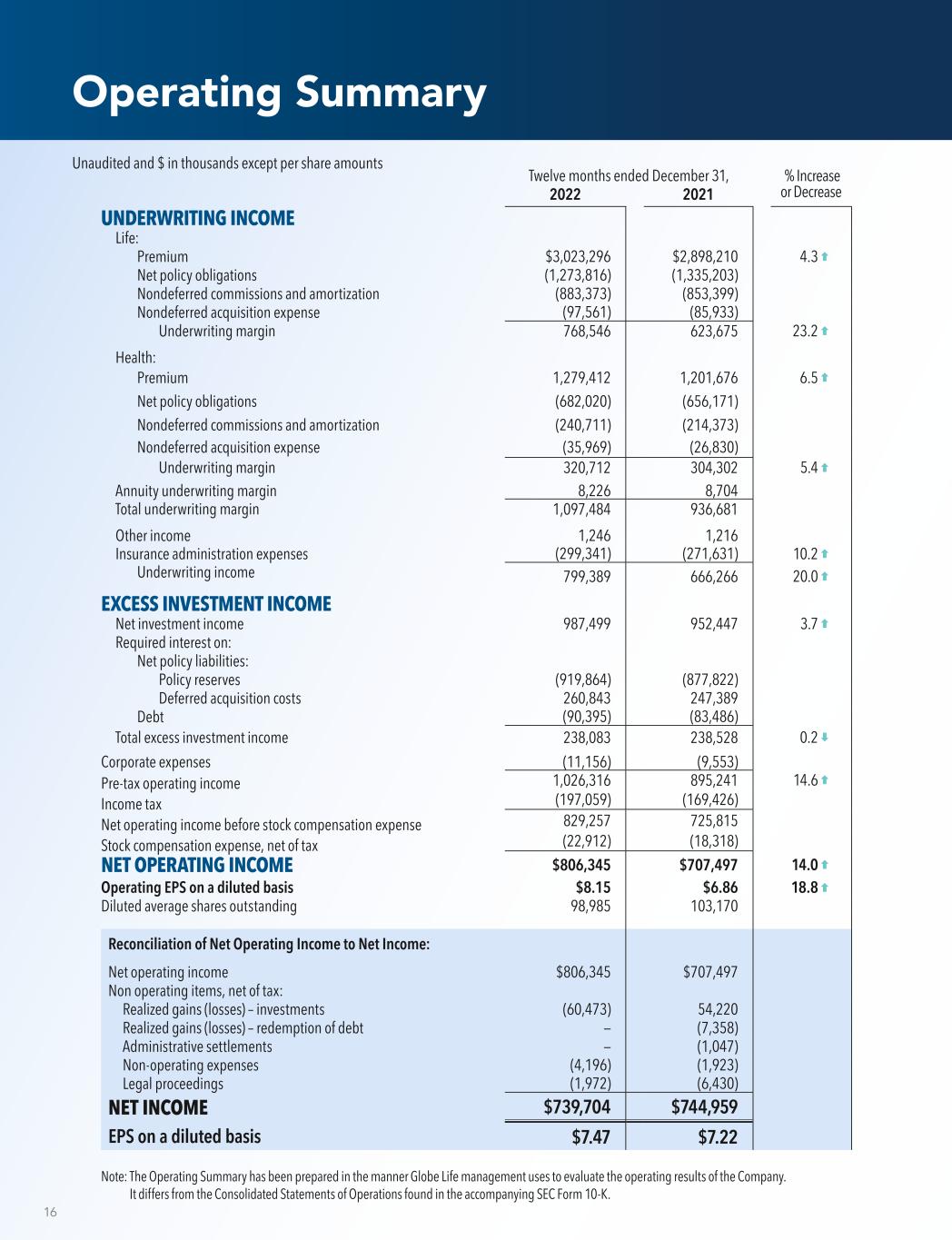 Operating Summary Unaudited and $ in thousands except per share amounts Note: The Operating Summary has been prepared in the manner Globe Life management uses to evaluate the operating results of the Company. It differs from the Consolidated Statements of Operations found in the accompanying SEC Form 10-K. Twelve months ended December 31, % Increase or Decrease2022 2021 UNDERWRITING INCOME Life: Premium $3,023,296 $2,898,210 4.3 Net policy obligations (1,273,816) (1,335,203) Nondeferred commissions and amortization (883,373) (853,399) Nondeferred acquisition expense (97,561) (85,933) Underwriting margin 768,546 623,675 23.2 Health: Premium 1,279,412 1,201,676 6.5 Net policy obligations (682,020) (656,171) Nondeferred commissions and amortization (240,711) (214,373) Nondeferred acquisition expense (35,969) (26,830) Underwriting margin 320,712 304,302 5.4 Annuity underwriting margin 8,226 8,704 Total underwriting margin 1,097,484 936,681 Other income 1,246 1,216 Insurance administration expenses (299,341) (271,631) 10.2 Underwriting income 799,389 666,266 20.0 EXCESS INVESTMENT INCOME Net investment income 987,499 952,447 3.7 Required interest on: Net policy liabilities: Policy reserves (919,864) (877,822) Deferred acquisition costs 260,843 247,389 Debt (90,395) (83,486) Total excess investment income 238,083 238,528 0.2 Corporate expenses (11,156) (9,553) Pre-tax operating income 1,026,316 895,241 14.6 Income tax (197,059) (169,426) Net operating income before stock compensation expense 829,257 725,815 Stock compensation expense, net of tax (22,912) (18,318) NET OPERATING INCOME $806,345 $707,497 14.0 Operating EPS on a diluted basis $8.15 $6.86 18.8 Diluted average shares outstanding 98,985 103,170 Reconciliation of Net Operating Income to Net Income: Net operating income $806,345 $707,497 Non operating items, net of tax: Realized gains (losses) – investments (60,473) 54,220 Realized gains (losses) – redemption of debt — (7,358) Administrative settlements — (1,047) Non-operating expenses (4,196) (1,923) Legal proceedings (1,972) (6,430) NET INCOME $739,704 $744,959 EPS on a diluted basis $7.47 $7.22 16