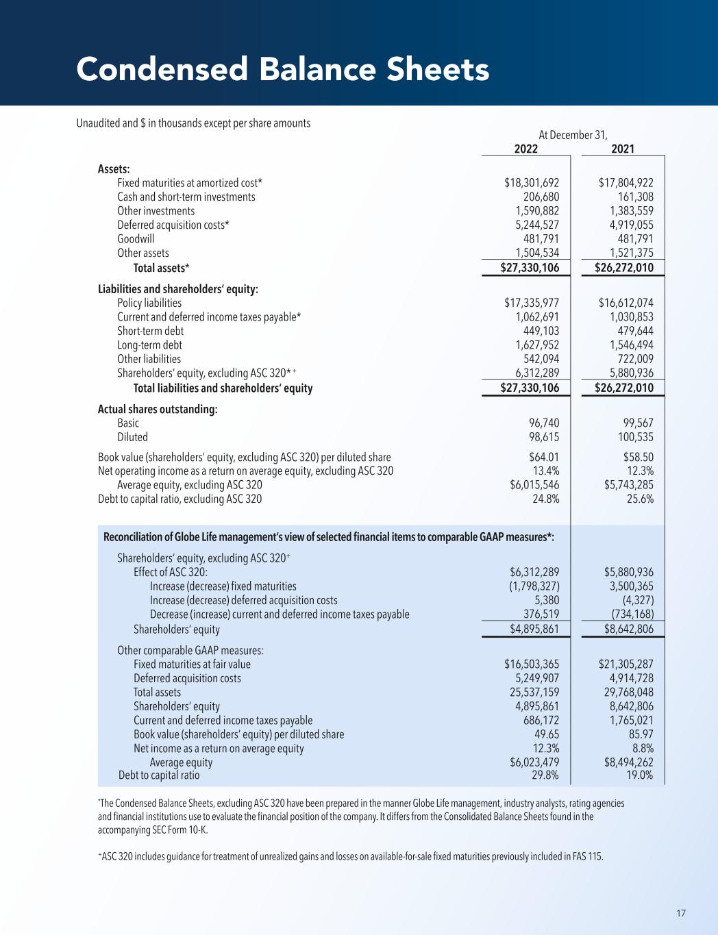 Condensed Balance Sheets Unaudited and $ in thousands except per share amounts *The Condensed Balance Sheets, excluding ASC 320 have been prepared in the manner Globe Life management, industry analysts, rating agencies and financial institutions use to evaluate the financial position of the company. It differs from the Consolidated Balance Sheets found in the accompanying SEC Form 10-K. +ASC 320 includes guidance for treatment of unrealized gains and losses on available-for-sale fixed maturities previously included in FAS 115. At December 31, 2022 2021 Assets: Fixed maturities at amortized cost* $18,301,692 $17,804,922 Cash and short-term investments 206,680 161,308 Other investments 1,590,882 1,383,559 Deferred acquisition costs* 5,244,527 4,919,055 Goodwill 481,791 481,791 Other assets 1,504,534 1,521,375 Total assets* $27,330,106 $26,272,010 Liabilities and shareholders’ equity: Policy liabilities $17,335,977 $16,612,074 Current and deferred income taxes payable* 1,062,691 1,030,853 Short-term debt 449,103 479,644 Long-term debt 1,627,952 1,546,494 Other liabilities 542,094 722,009 Shareholders’ equity, excluding ASC 320*+ 6,312,289 5,880,936 Total liabilities and shareholders’ equity $27,330,106 $26,272,010 Actual shares outstanding: Basic 96,740 99,567 Diluted 98,615 100,535 Book value (shareholders’ equity, excluding ASC 320) per diluted share $64.01 $58.50 Net operating income as a return on average equity, excluding ASC 320 13.4% 12.3% Average equity, excluding ASC 320 $6,015,546 $5,743,285 Debt to capital ratio, excluding ASC 320 24.8% 25.6% Reconciliation of Globe Life management’s view of selected financial items to comparable GAAP measures*: Shareholders’ equity, excluding ASC 320+ Effect of ASC 320: $6,312,289 $5,880,936 Increase (decrease) fixed maturities (1,798,327) 3,500,365 Increase (decrease) deferred acquisition costs 5,380 (4,327) Decrease (increase) current and deferred income taxes payable 376,519 (734,168) Shareholders’ equity $4,895,861 $8,642,806 Other comparable GAAP measures: Fixed maturities at fair value $16,503,365 $21,305,287 Deferred acquisition costs 5,249,907 4,914,728 Total assets 25,537,159 29,768,048 Shareholders’ equity 4,895,861 8,642,806 Current and deferred income taxes payable 686,172 1,765,021 Book value (shareholders’ equity) per diluted share 49.65 85.97 Net income as a return on average equity 12.3% 8.8% Average equity $6,023,479 $8,494,262 Debt to capital ratio 29.8% 19.0% 17