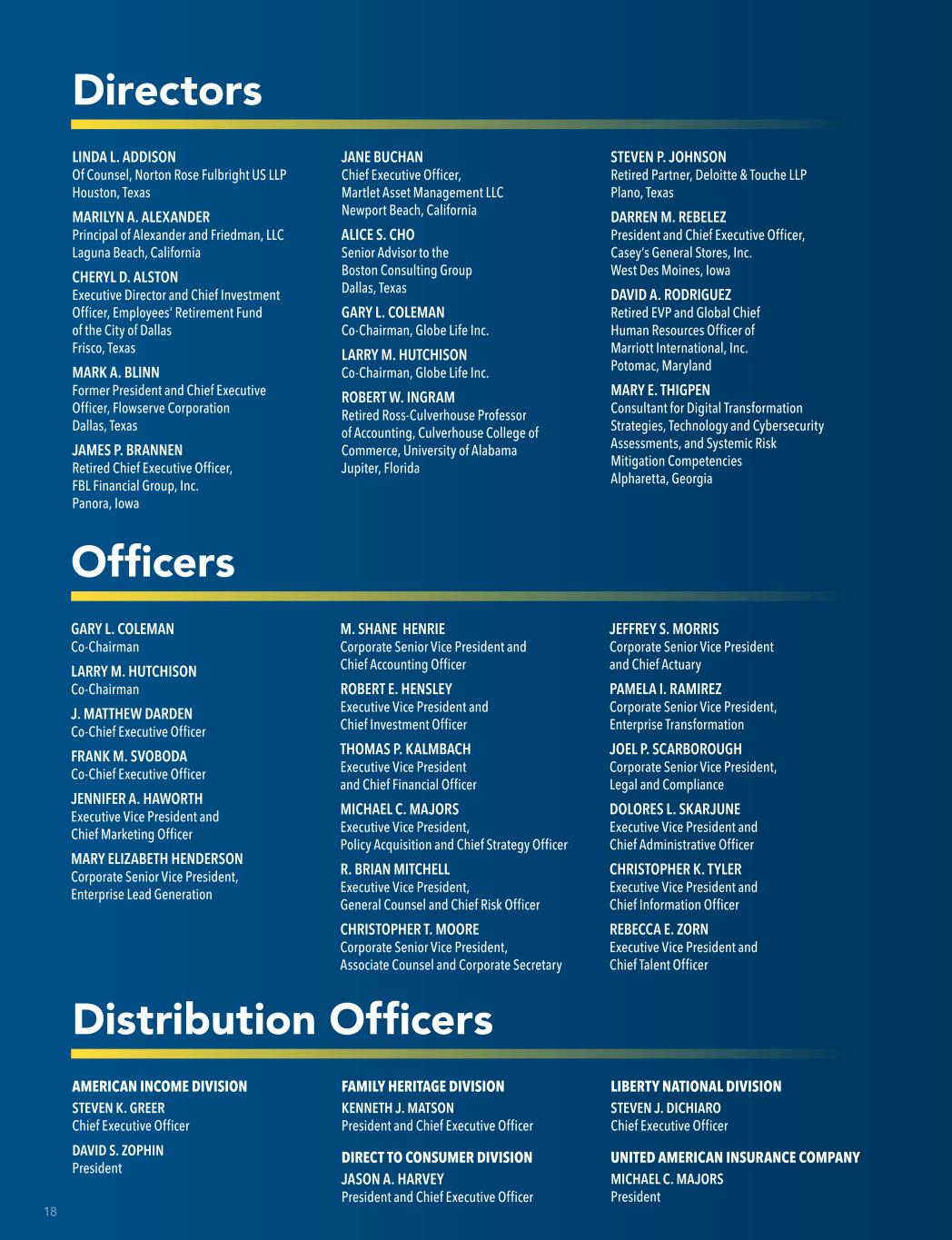 LINDA L. ADDISON Of Counsel, Norton Rose Fulbright US LLP Houston, Texas MARILYN A. ALEXANDER Principal of Alexander and Friedman, LLC Laguna Beach, California CHERYL D. ALSTON Executive Director and Chief Investment Officer, Employees’ Retirement Fund of the City of Dallas Frisco, Texas MARK A. BLINN Former President and Chief Executive Officer, Flowserve Corporation Dallas, Texas JAMES P. BRANNEN Retired Chief Executive Officer, FBL Financial Group, Inc. Panora, Iowa JANE BUCHAN Chief Executive Officer, Martlet Asset Management LLC Newport Beach, California ALICE S. CHO Senior Advisor to the Boston Consulting Group Dallas, Texas GARY L. COLEMAN Co-Chairman, Globe Life Inc. LARRY M. HUTCHISON Co-Chairman, Globe Life Inc. ROBERT W. INGRAM Retired Ross-Culverhouse Professor of Accounting, Culverhouse College of Commerce, University of Alabama Jupiter, Florida STEVEN P. JOHNSON Retired Partner, Deloitte & Touche LLP Plano, Texas DARREN M. REBELEZ President and Chief Executive Officer, Casey’s General Stores, Inc. West Des Moines, Iowa DAVID A. RODRIGUEZ Retired EVP and Global Chief Human Resources Officer of Marriott International, Inc. Potomac, Maryland MARY E. THIGPEN Consultant for Digital Transformation Strategies, Technology and Cybersecurity Assessments, and Systemic Risk Mitigation Competencies Alpharetta, Georgia Directors GARY L. COLEMAN Co-Chairman LARRY M. HUTCHISON Co-Chairman J. MATTHEW DARDEN Co-Chief Executive Officer FRANK M. SVOBODA Co-Chief Executive Officer JENNIFER A. HAWORTH Executive Vice President and Chief Marketing Officer MARY ELIZABETH HENDERSON Corporate Senior Vice President, Enterprise Lead Generation M. SHANE HENRIE Corporate Senior Vice President and Chief Accounting Officer ROBERT E. HENSLEY Executive Vice President and Chief Investment Officer THOMAS P. KALMBACH Executive Vice President and Chief Financial Officer MICHAEL C. MAJORS Executive Vice President, Policy Acquisition and Chief Strategy Officer R. BRIAN MITCHELL Executive Vice President, General Counsel and Chief Risk Officer CHRISTOPHER T. MOORE Corporate Senior Vice President, Associate Counsel and Corporate Secretary JEFFREY S. MORRIS Corporate Senior Vice President and Chief Actuary PAMELA I. RAMIREZ Corporate Senior Vice President, Enterprise Transformation JOEL P. SCARBOROUGH Corporate Senior Vice President, Legal and Compliance DOLORES L. SKARJUNE Executive Vice President and Chief Administrative Officer CHRISTOPHER K. TYLER Executive Vice President and Chief Information Officer REBECCA E. ZORN Executive Vice President and Chief Talent Officer Officers AMERICAN INCOME DIVISION STEVEN K. GREER Chief Executive Officer DAVID S. ZOPHIN President FAMILY HERITAGE DIVISION KENNETH J. MATSON President and Chief Executive Officer DIRECT TO CONSUMER DIVISION JASON A. HARVEY President and Chief Executive Officer LIBERTY NATIONAL DIVISION STEVEN J. DICHIARO Chief Executive Officer UNITED AMERICAN INSURANCE COMPANY MICHAEL C. MAJORS President Distribution Officers 18