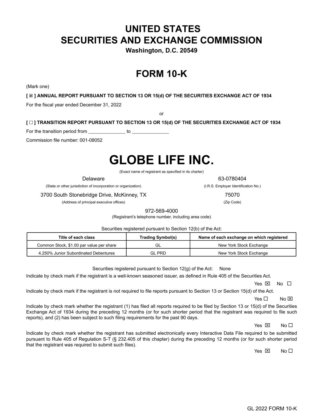 UNITED STATES SECURITIES AND EXCHANGE COMMISSION Washington, D.C. 20549 FORM 10-K (Mark one) [ ☒ ] ANNUAL REPORT PURSUANT TO SECTION 13 OR 15(d) OF THE SECURITIES EXCHANGE ACT OF 1934 For the fiscal year ended December 31, 2022 or [ ☐ ] TRANSITION REPORT PURSUANT TO SECTION 13 OR 15(d) OF THE SECURITIES EXCHANGE ACT OF 1934 For the transition period from to Commission file number: 001-08052 GLOBE LIFE INC. (Exact name of registrant as specified in its charter) Delaware 63-0780404 (State or other jurisdiction of incorporation or organization) (I.R.S. Employer Identification No.) 3700 South Stonebridge Drive, McKinney, TX 75070 (Address of principal executive offices) (Zip Code) 972-569-4000 (Registrant’s telephone number, including area code) Securities registered pursuant to Section 12(b) of the Act: Title of each class Trading Symbol(s) Name of each exchange on which registered Common Stock, $1.00 par value per share GL New York Stock Exchange 4.250% Junior Subordinated Debentures GL PRD New York Stock Exchange Securities registered pursuant to Section 12(g) of the Act: None Indicate by check mark if the registrant is a well-known seasoned issuer, as defined in Rule 405 of the Securities Act. Yes x No ¨ Indicate by check mark if the registrant is not required to file reports pursuant to Section 13 or Section 15(d) of the Act. Yes ¨ No x Indicate by check mark whether the registrant (1) has filed all reports required to be filed by Section 13 or 15(d) of the Securities Exchange Act of 1934 during the preceding 12 months (or for such shorter period that the registrant was required to file such reports), and (2) has been subject to such filing requirements for the past 90 days. Yes x No ¨ Indicate by check mark whether the registrant has submitted electronically every Interactive Data File required to be submitted pursuant to Rule 405 of Regulation S-T (§ 232.405 of this chapter) during the preceding 12 months (or for such shorter period that the registrant was required to submit such files). Yes x No ¨ GL 2022 FORM 10-K