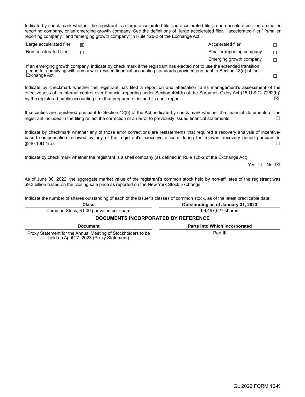 Indicate by check mark whether the registrant is a large accelerated filer, an accelerated filer, a non-accelerated filer, a smaller reporting company, or an emerging growth company. See the definitions of “large accelerated filer,” “accelerated filer,” “smaller reporting company,” and "emerging growth company" in Rule 12b-2 of the Exchange Act.: Large accelerated filer x Accelerated filer ¨ Non-accelerated filer ¨ Smaller reporting company ¨ Emerging growth company ¨ If an emerging growth company, indicate by check mark if the registrant has elected not to use the extended transition period for complying with any new or revised financial accounting standards provided pursuant to Section 13(a) of the Exchange Act. ¨ Indicate by checkmark whether the registrant has filed a report on and attestation to its management's assessment of the effectiveness of its internal control over financial reporting under Section 404(b) of the Sarbanes-Oxley Act (15 U.S.C. 7262(b)) by the registered public accounting firm that prepared or issued its audit report. x If securities are registered pursuant to Section 12(b) of the Act, indicate by check mark whether the financial statements of the registrant included in the filing reflect the correction of an error to previously issued financial statements. ☐ Indicate by checkmark whether any of those error corrections are restatements that required a recovery analysis of incentive- based compensation received by any of the registrant's executive officers during the relevant recovery period pursuant to §240.10D-1(b). ☐ Indicate by check mark whether the registrant is a shell company (as defined in Rule 12b-2 of the Exchange Act). Yes ☐ No x As of June 30, 2022, the aggregate market value of the registrant’s common stock held by non-affiliates of the registrant was $9.3 billion based on the closing sale price as reported on the New York Stock Exchange. Indicate the number of shares outstanding of each of the issuer’s classes of common stock, as of the latest practicable date. Class Outstanding as of January 31, 2023 Common Stock, $1.00 par value per share 96,497,627 shares DOCUMENTS INCORPORATED BY REFERENCE Document Parts Into Which Incorporated Proxy Statement for the Annual Meeting of Stockholders to be held on April 27, 2023 (Proxy Statement) Part III GL 2022 FORM 10-K