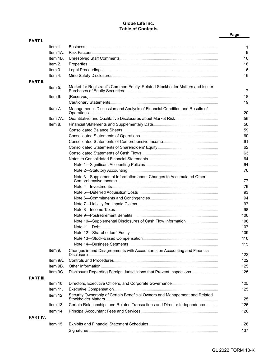 Globe Life Inc. Table of Contents Page PART I. Item 1. Business .................................................................................................................................. 1 Item 1A. Risk Factors ............................................................................................................................ 9 Item 1B. Unresolved Staff Comments ................................................................................................ 16 Item 2. Properties ................................................................................................................................ 16 Item 3. Legal Proceedings ................................................................................................................. 16 Item 4. Mine Safety Disclosures ....................................................................................................... 16 PART II. Item 5. Market for Registrant’s Common Equity, Related Stockholder Matters and Issuer Purchases of Equity Securities ............................................................................................ 17 Item 6. [Reserved]............................................................................................................................... 18 Cautionary Statements.......................................................................................................... 19 Item 7. Management’s Discussion and Analysis of Financial Condition and Results of Operations............................................................................................................................... 20 Item 7A. Quantitative and Qualitative Disclosures about Market Risk .......................................... 56 Item 8. Financial Statements and Supplementary Data................................................................ 56 Consolidated Balance Sheets.............................................................................................. 59 Consolidated Statements of Operations ............................................................................ 60 Consolidated Statements of Comprehensive Income...................................................... 61 Consolidated Statements of Shareholders' Equity ........................................................... 62 Consolidated Statements of Cash Flows ........................................................................... 63 Notes to Consolidated Financial Statements .................................................................... 64 Note 1—Significant Accounting Policies ....................................................................... 64 Note 2—Statutory Accounting......................................................................................... 76 Note 3—Supplemental Information about Changes to Accumulated Other Comprehensive Income ................................................................................................... 77 Note 4—Investments........................................................................................................ 79 Note 5—Deferred Acquisition Costs .............................................................................. 93 Note 6—Commitments and Contingencies................................................................... 94 Note 7—Liability for Unpaid Claims ............................................................................... 97 Note 8—Income Taxes..................................................................................................... 98 Note 9—Postretirement Benefits.................................................................................... 100 Note 10—Supplemental Disclosures of Cash Flow Information ............................... 106 Note 11—Debt ................................................................................................................... 107 Note 12—Shareholders' Equity ...................................................................................... 109 Note 13—Stock-Based Compensation.......................................................................... 110 Note 14—Business Segments........................................................................................ 115 Item 9. Changes in and Disagreements with Accountants on Accounting and Financial Disclosure................................................................................................................................ 122 Item 9A. Controls and Procedures ...................................................................................................... 122 Item 9B. Other Information ................................................................................................................... 125 Item 9C. Disclosure Regarding Foreign Jurisdictions that Prevent Inspections .......................... 125 PART III. Item 10. Directors, Executive Officers, and Corporate Governance ............................................. 125 Item 11. Executive Compensation ...................................................................................................... 125 Item 12. Security Ownership of Certain Beneficial Owners and Management and Related Stockholder Matters............................................................................................................... 125 Item 13. Certain Relationships and Related Transactions and Director Independence ............ 126 Item 14. Principal Accountant Fees and Services............................................................................ 126 PART IV. Item 15. Exhibits and Financial Statement Schedules .................................................................... 126 Signatures ............................................................................................................................... 137 GL 2022 FORM 10-K