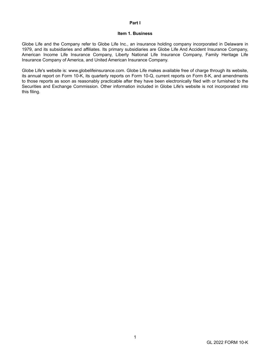 Part I Item 1. Business Globe Life and the Company refer to Globe Life Inc., an insurance holding company incorporated in Delaware in 1979, and its subsidiaries and affiliates. Its primary subsidiaries are Globe Life And Accident Insurance Company, American Income Life Insurance Company, Liberty National Life Insurance Company, Family Heritage Life Insurance Company of America, and United American Insurance Company. Globe Life's website is: www.globelifeinsurance.com. Globe Life makes available free of charge through its website, its annual report on Form 10-K, its quarterly reports on Form 10-Q, current reports on Form 8-K, and amendments to those reports as soon as reasonably practicable after they have been electronically filed with or furnished to the Securities and Exchange Commission. Other information included in Globe Life's website is not incorporated into this filing. 1 GL 2022 FORM 10-K