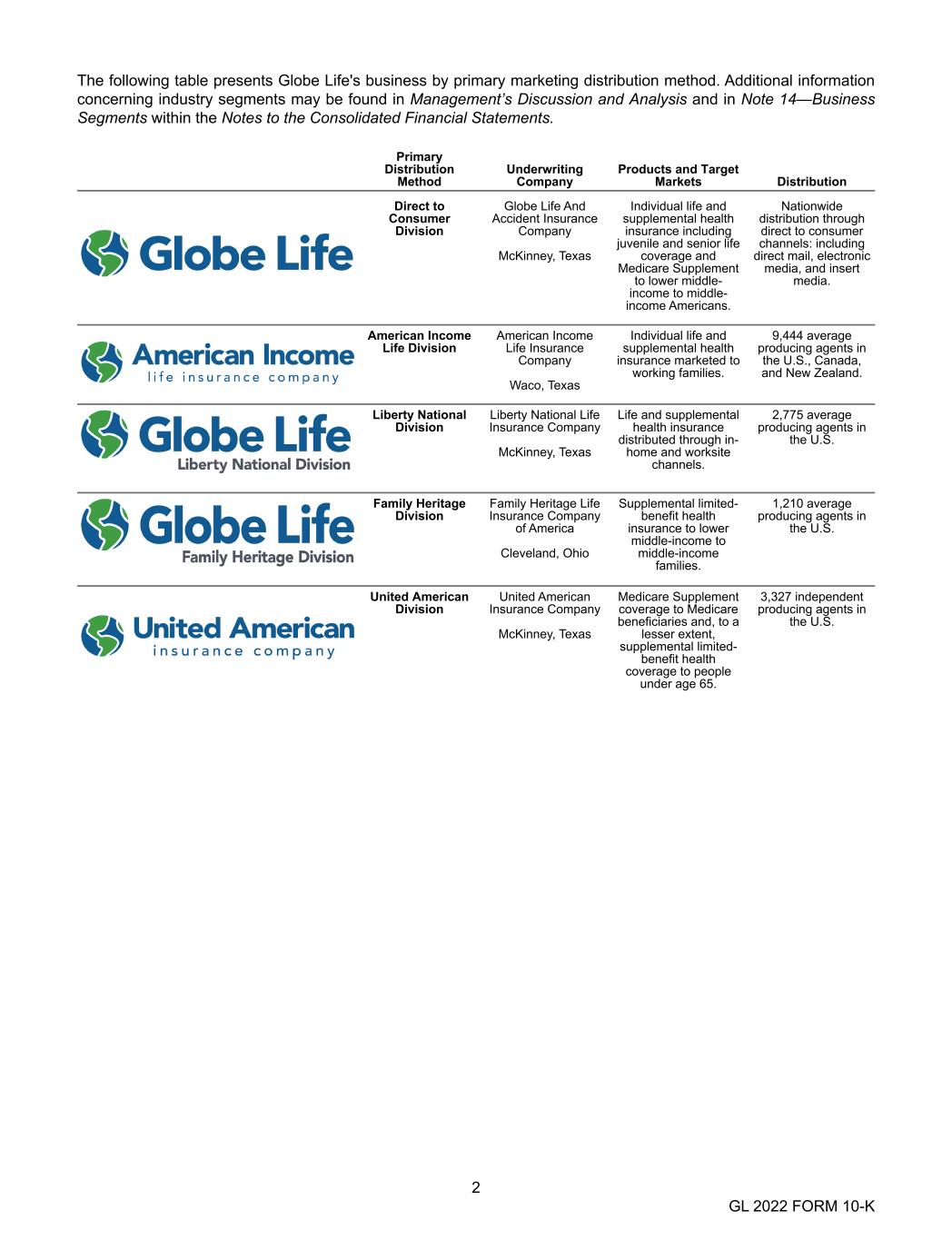 The following table presents Globe Life's business by primary marketing distribution method. Additional information concerning industry segments may be found in Management’s Discussion and Analysis and in Note 14—Business Segments within the Notes to the Consolidated Financial Statements. Primary Distribution Method Underwriting Company Products and Target Markets Distribution Direct to Consumer Division Globe Life And Accident Insurance Company McKinney, Texas Individual life and supplemental health insurance including juvenile and senior life coverage and Medicare Supplement to lower middle- income to middle- income Americans. Nationwide distribution through direct to consumer channels: including direct mail, electronic media, and insert media. American Income Life Division American Income Life Insurance Company Waco, Texas Individual life and supplemental health insurance marketed to working families. 9,444 average producing agents in the U.S., Canada, and New Zealand. Liberty National Division Liberty National Life Insurance Company McKinney, Texas Life and supplemental health insurance distributed through in- home and worksite channels. 2,775 average producing agents in the U.S. Family Heritage Division Family Heritage Life Insurance Company of America Cleveland, Ohio Supplemental limited- benefit health insurance to lower middle-income to middle-income families. 1,210 average producing agents in the U.S. United American Division United American Insurance Company McKinney, Texas Medicare Supplement coverage to Medicare beneficiaries and, to a lesser extent, supplemental limited- benefit health coverage to people under age 65. 3,327 independent producing agents in the U.S. 2 GL 2022 FORM 10-K