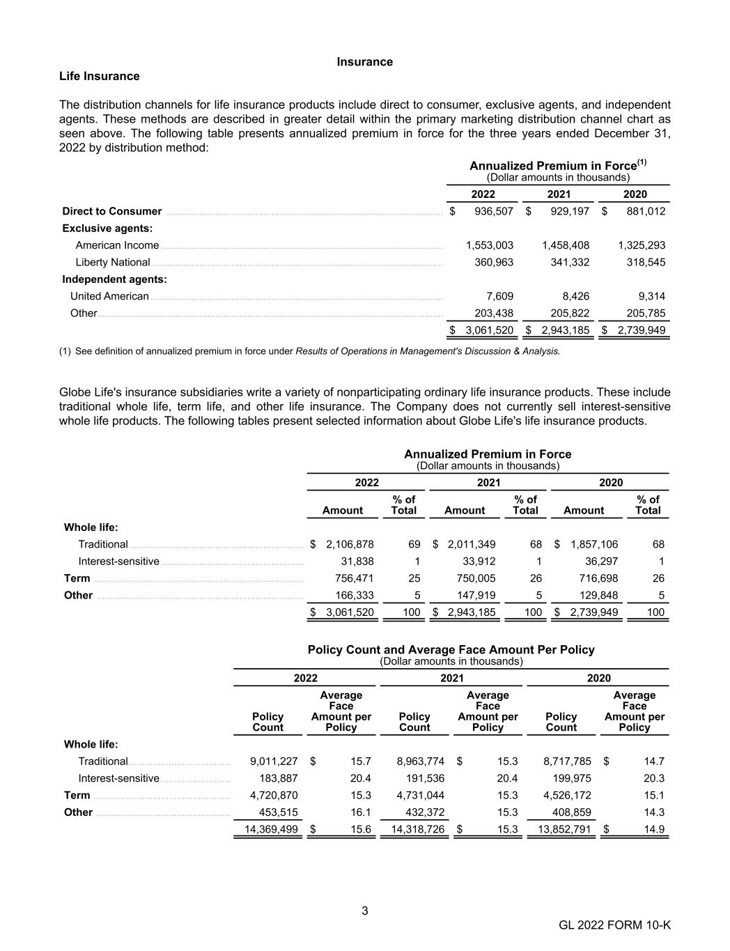 Insurance Life Insurance The distribution channels for life insurance products include direct to consumer, exclusive agents, and independent agents. These methods are described in greater detail within the primary marketing distribution channel chart as seen above. The following table presents annualized premium in force for the three years ended December 31, 2022 by distribution method: Annualized Premium in Force(1) (Dollar amounts in thousands) 2022 2021 2020 Direct to Consumer ....................................................................................................... $ 936,507 $ 929,197 $ 881,012 Exclusive agents: American Income ......................................................................................................... 1,553,003 1,458,408 1,325,293 Liberty National............................................................................................................. 360,963 341,332 318,545 Independent agents: United American ............................................................................................................. 7,609 8,426 9,314 Other................................................................................................................................. 203,438 205,822 205,785 $ 3,061,520 $ 2,943,185 $ 2,739,949 (1) See definition of annualized premium in force under Results of Operations in Management's Discussion & Analysis. Globe Life's insurance subsidiaries write a variety of nonparticipating ordinary life insurance products. These include traditional whole life, term life, and other life insurance. The Company does not currently sell interest-sensitive whole life products. The following tables present selected information about Globe Life's life insurance products. Annualized Premium in Force (Dollar amounts in thousands) 2022 2021 2020 Amount % of Total Amount % of Total Amount % of Total Whole life: Traditional ................................................................. $ 2,106,878 69 $ 2,011,349 68 $ 1,857,106 68 Interest-sensitive ..................................................... 31,838 1 33,912 1 36,297 1 Term .............................................................................. 756,471 25 750,005 26 716,698 26 Other ............................................................................. 166,333 5 147,919 5 129,848 5 $ 3,061,520 100 $ 2,943,185 100 $ 2,739,949 100 Policy Count and Average Face Amount Per Policy (Dollar amounts in thousands) 2022 2021 2020 Policy Count Average Face Amount per Policy Policy Count Average Face Amount per Policy Policy Count Average Face Amount per Policy Whole life: Traditional...................................... 9,011,227 $ 15.7 8,963,774 $ 15.3 8,717,785 $ 14.7 Interest-sensitive .......................... 183,887 20.4 191,536 20.4 199,975 20.3 Term ................................................... 4,720,870 15.3 4,731,044 15.3 4,526,172 15.1 Other .................................................. 453,515 16.1 432,372 15.3 408,859 14.3 14,369,499 $ 15.6 14,318,726 $ 15.3 13,852,791 $ 14.9 3 GL 2022 FORM 10-K