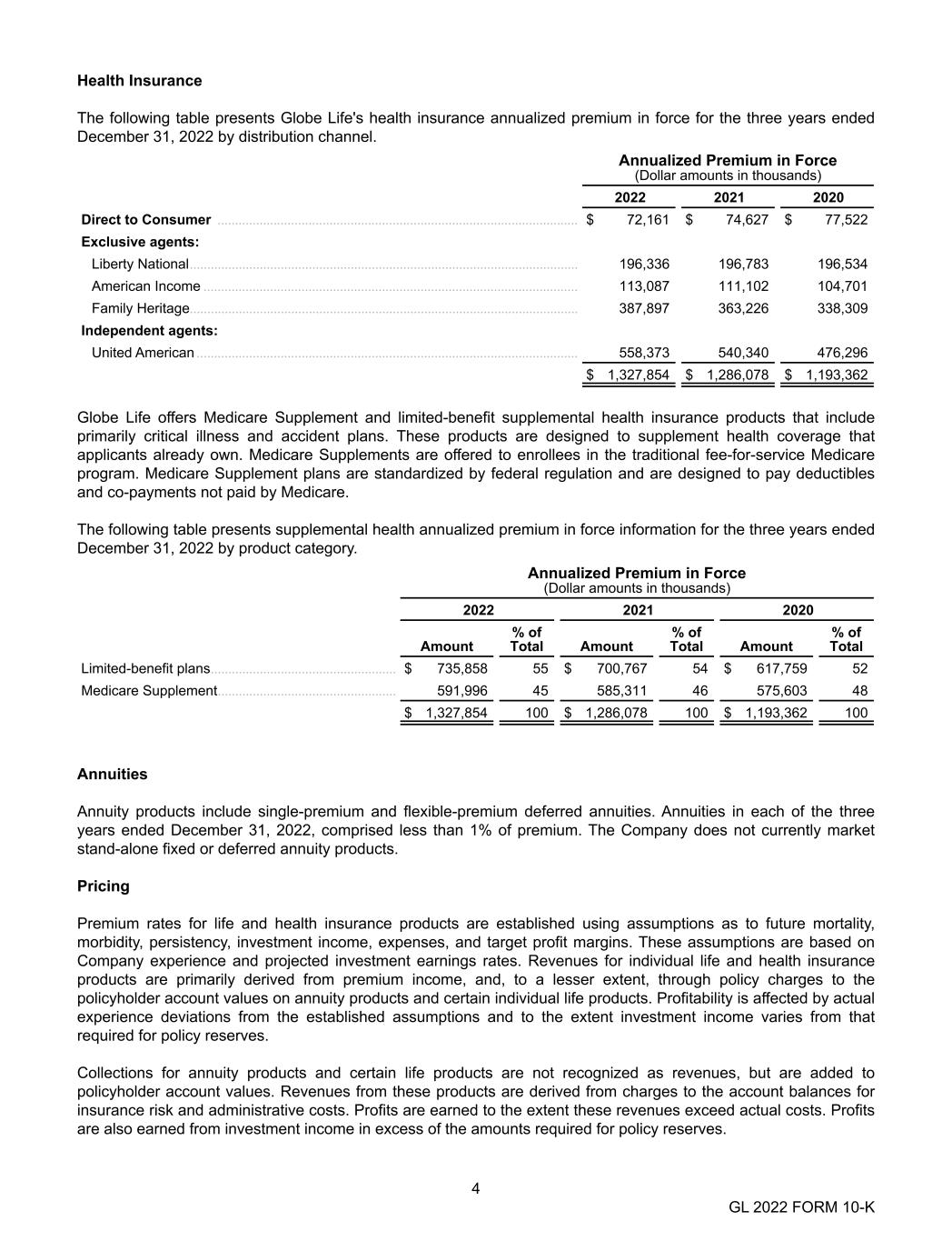 Health Insurance The following table presents Globe Life's health insurance annualized premium in force for the three years ended December 31, 2022 by distribution channel. Annualized Premium in Force (Dollar amounts in thousands) 2022 2021 2020 Direct to Consumer ....................................................................................................... $ 72,161 $ 74,627 $ 77,522 Exclusive agents: Liberty National............................................................................................................... 196,336 196,783 196,534 American Income ........................................................................................................... 113,087 111,102 104,701 Family Heritage............................................................................................................... 387,897 363,226 338,309 Independent agents: United American ............................................................................................................. 558,373 540,340 476,296 $ 1,327,854 $ 1,286,078 $ 1,193,362 Globe Life offers Medicare Supplement and limited-benefit supplemental health insurance products that include primarily critical illness and accident plans. These products are designed to supplement health coverage that applicants already own. Medicare Supplements are offered to enrollees in the traditional fee-for-service Medicare program. Medicare Supplement plans are standardized by federal regulation and are designed to pay deductibles and co-payments not paid by Medicare. The following table presents supplemental health annualized premium in force information for the three years ended December 31, 2022 by product category. Annualized Premium in Force (Dollar amounts in thousands) 2022 2021 2020 Amount % of Total Amount % of Total Amount % of Total Limited-benefit plans..................................................... $ 735,858 55 $ 700,767 54 $ 617,759 52 Medicare Supplement................................................... 591,996 45 585,311 46 575,603 48 $ 1,327,854 100 $ 1,286,078 100 $ 1,193,362 100 Annuities Annuity products include single-premium and flexible-premium deferred annuities. Annuities in each of the three years ended December 31, 2022, comprised less than 1% of premium. The Company does not currently market stand-alone fixed or deferred annuity products. Pricing Premium rates for life and health insurance products are established using assumptions as to future mortality, morbidity, persistency, investment income, expenses, and target profit margins. These assumptions are based on Company experience and projected investment earnings rates. Revenues for individual life and health insurance products are primarily derived from premium income, and, to a lesser extent, through policy charges to the policyholder account values on annuity products and certain individual life products. Profitability is affected by actual experience deviations from the established assumptions and to the extent investment income varies from that required for policy reserves. Collections for annuity products and certain life products are not recognized as revenues, but are added to policyholder account values. Revenues from these products are derived from charges to the account balances for insurance risk and administrative costs. Profits are earned to the extent these revenues exceed actual costs. Profits are also earned from investment income in excess of the amounts required for policy reserves. 4 GL 2022 FORM 10-K