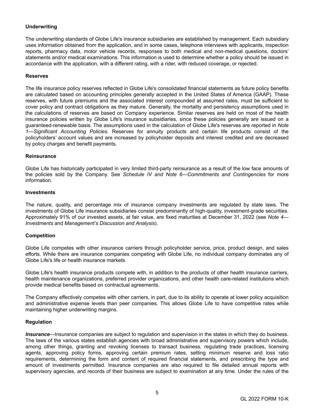 Underwriting The underwriting standards of Globe Life's insurance subsidiaries are established by management. Each subsidiary uses information obtained from the application, and in some cases, telephone interviews with applicants, inspection reports, pharmacy data, motor vehicle records, responses to both medical and non-medical questions, doctors’ statements and/or medical examinations. This information is used to determine whether a policy should be issued in accordance with the application, with a different rating, with a rider, with reduced coverage, or rejected. Reserves The life insurance policy reserves reflected in Globe Life's consolidated financial statements as future policy benefits are calculated based on accounting principles generally accepted in the United States of America (GAAP). These reserves, with future premiums and the associated interest compounded at assumed rates, must be sufficient to cover policy and contract obligations as they mature. Generally, the mortality and persistency assumptions used in the calculations of reserves are based on Company experience. Similar reserves are held on most of the health insurance policies written by Globe Life's insurance subsidiaries, since these policies generally are issued on a guaranteed-renewable basis. The assumptions used in the calculation of Globe Life's reserves are reported in Note 1—Significant Accounting Policies. Reserves for annuity products and certain life products consist of the policyholders’ account values and are increased by policyholder deposits and interest credited and are decreased by policy charges and benefit payments. Reinsurance Globe Life has historically participated in very limited third-party reinsurance as a result of the low face amounts of the policies sold by the Company. See Schedule IV and Note 6—Commitments and Contingencies for more information. Investments The nature, quality, and percentage mix of insurance company investments are regulated by state laws. The investments of Globe Life insurance subsidiaries consist predominantly of high-quality, investment-grade securities. Approximately 91% of our invested assets, at fair value, are fixed maturities at December 31, 2022 (see Note 4— Investments and Management’s Discussion and Analysis). Competition Globe Life competes with other insurance carriers through policyholder service, price, product design, and sales efforts. While there are insurance companies competing with Globe Life, no individual company dominates any of Globe Life's life or health insurance markets. Globe Life's health insurance products compete with, in addition to the products of other health insurance carriers, health maintenance organizations, preferred provider organizations, and other health care-related institutions which provide medical benefits based on contractual agreements. The Company effectively competes with other carriers, in part, due to its ability to operate at lower policy acquisition and administrative expense levels than peer companies. This allows Globe Life to have competitive rates while maintaining higher underwriting margins. Regulation Insurance—Insurance companies are subject to regulation and supervision in the states in which they do business. The laws of the various states establish agencies with broad administrative and supervisory powers which include, among other things, granting and revoking licenses to transact business, regulating trade practices, licensing agents, approving policy forms, approving certain premium rates, setting minimum reserve and loss ratio requirements, determining the form and content of required financial statements, and prescribing the type and amount of investments permitted. Insurance companies are also required to file detailed annual reports with supervisory agencies, and records of their business are subject to examination at any time. Under the rules of the 5 GL 2022 FORM 10-K