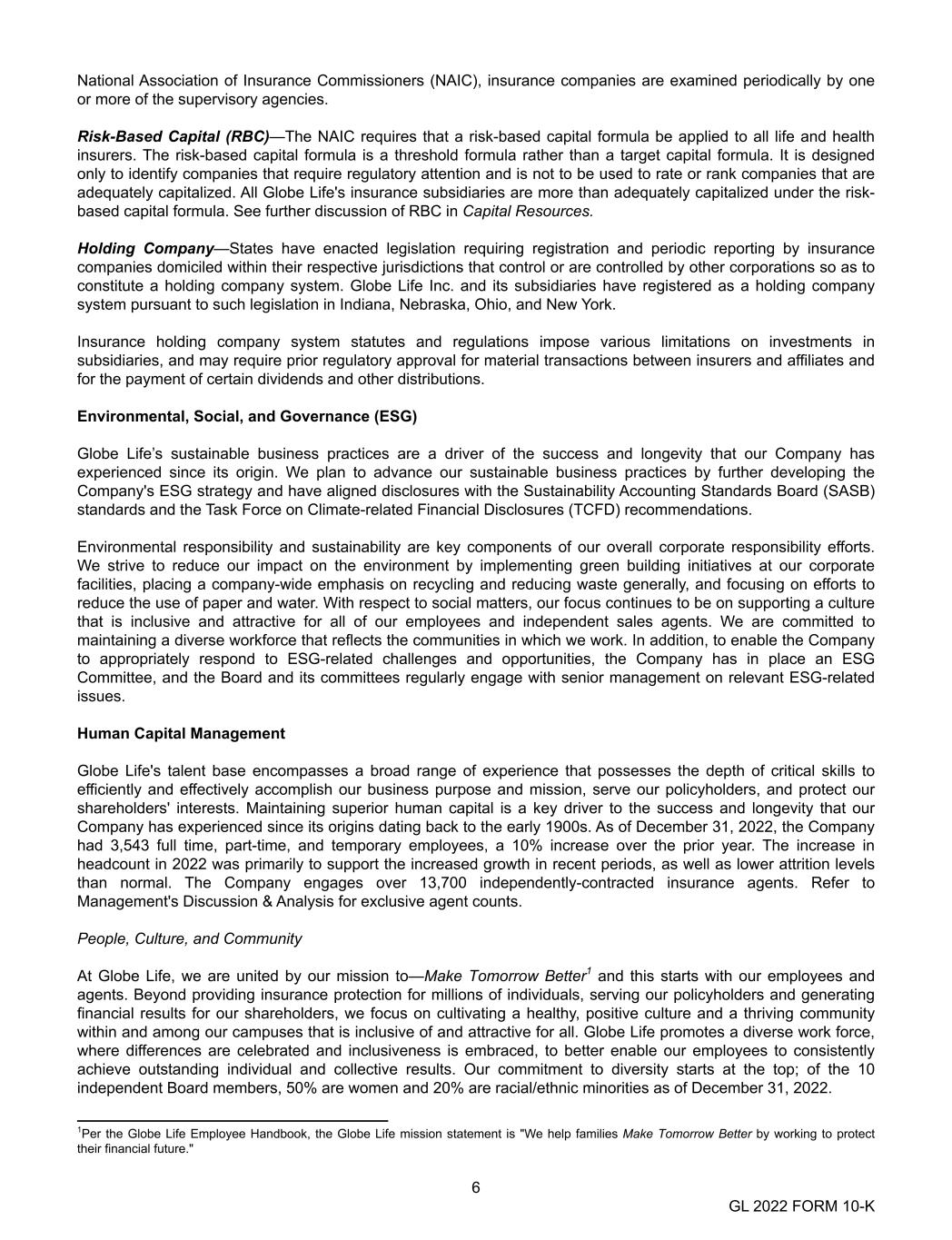 National Association of Insurance Commissioners (NAIC), insurance companies are examined periodically by one or more of the supervisory agencies. Risk-Based Capital (RBC)—The NAIC requires that a risk-based capital formula be applied to all life and health insurers. The risk-based capital formula is a threshold formula rather than a target capital formula. It is designed only to identify companies that require regulatory attention and is not to be used to rate or rank companies that are adequately capitalized. All Globe Life's insurance subsidiaries are more than adequately capitalized under the risk- based capital formula. See further discussion of RBC in Capital Resources. Holding Company—States have enacted legislation requiring registration and periodic reporting by insurance companies domiciled within their respective jurisdictions that control or are controlled by other corporations so as to constitute a holding company system. Globe Life Inc. and its subsidiaries have registered as a holding company system pursuant to such legislation in Indiana, Nebraska, Ohio, and New York. Insurance holding company system statutes and regulations impose various limitations on investments in subsidiaries, and may require prior regulatory approval for material transactions between insurers and affiliates and for the payment of certain dividends and other distributions. Environmental, Social, and Governance (ESG) Globe Life’s sustainable business practices are a driver of the success and longevity that our Company has experienced since its origin. We plan to advance our sustainable business practices by further developing the Company's ESG strategy and have aligned disclosures with the Sustainability Accounting Standards Board (SASB) standards and the Task Force on Climate-related Financial Disclosures (TCFD) recommendations. Environmental responsibility and sustainability are key components of our overall corporate responsibility efforts. We strive to reduce our impact on the environment by implementing green building initiatives at our corporate facilities, placing a company-wide emphasis on recycling and reducing waste generally, and focusing on efforts to reduce the use of paper and water. With respect to social matters, our focus continues to be on supporting a culture that is inclusive and attractive for all of our employees and independent sales agents. We are committed to maintaining a diverse workforce that reflects the communities in which we work. In addition, to enable the Company to appropriately respond to ESG-related challenges and opportunities, the Company has in place an ESG Committee, and the Board and its committees regularly engage with senior management on relevant ESG-related issues. Human Capital Management Globe Life's talent base encompasses a broad range of experience that possesses the depth of critical skills to efficiently and effectively accomplish our business purpose and mission, serve our policyholders, and protect our shareholders' interests. Maintaining superior human capital is a key driver to the success and longevity that our Company has experienced since its origins dating back to the early 1900s. As of December 31, 2022, the Company had 3,543 full time, part-time, and temporary employees, a 10% increase over the prior year. The increase in headcount in 2022 was primarily to support the increased growth in recent periods, as well as lower attrition levels than normal. The Company engages over 13,700 independently-contracted insurance agents. Refer to Management's Discussion & Analysis for exclusive agent counts. People, Culture, and Community At Globe Life, we are united by our mission to—Make Tomorrow Better1 and this starts with our employees and agents. Beyond providing insurance protection for millions of individuals, serving our policyholders and generating financial results for our shareholders, we focus on cultivating a healthy, positive culture and a thriving community within and among our campuses that is inclusive of and attractive for all. Globe Life promotes a diverse work force, where differences are celebrated and inclusiveness is embraced, to better enable our employees to consistently achieve outstanding individual and collective results. Our commitment to diversity starts at the top; of the 10 independent Board members, 50% are women and 20% are racial/ethnic minorities as of December 31, 2022. 6 GL 2022 FORM 10-K 1Per the Globe Life Employee Handbook, the Globe Life mission statement is "We help families Make Tomorrow Better by working to protect their financial future."