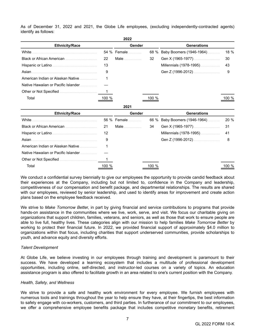 As of December 31, 2022 and 2021, the Globe Life employees, (excluding independently-contracted agents) identify as follows: 2022 Ethnicity/Race Gender Generations White...................................................................... 54 % Female .............. 68 % Baby Boomers (1946-1964) ............. 18 % Black or African American .................................. 22 Male ................... 32 Gen X (1965-1977) ............................ 30 Hispanic or Latino................................................ 13 Millennials (1978-1995)..................... 43 Asian...................................................................... 9 Gen Z (1996-2012) ............................ 9 American Indian or Alaskan Native................... 1 Native Hawaiian or Pacific Islander .................. — Other or Not Specified ........................................ 1 Total 100 % 100 % 100 % 2021 Ethnicity/Race Gender Generations White...................................................................... 56 % Female .............. 66 % Baby Boomers (1946-1964) ............. 20 % Black or African American .................................. 21 Male ................... 34 Gen X (1965-1977) ............................ 31 Hispanic or Latino................................................ 12 Millennials (1978-1995)..................... 41 Asian...................................................................... 9 Gen Z (1996-2012) ............................ 8 American Indian or Alaskan Native................... 1 Native Hawaiian or Pacific Islander .................. — Other or Not Specified ........................................ 1 Total 100 % 100 % 100 % We conduct a confidential survey biennially to give our employees the opportunity to provide candid feedback about their experiences at the Company, including but not limited to, confidence in the Company and leadership, competitiveness of our compensation and benefit package, and departmental relationships. The results are shared with our employees, reviewed by senior leadership, and used to identify areas for improvement and create action plans based on the employee feedback received. We strive to Make Tomorrow Better, in part by giving financial and service contributions to programs that provide hands-on assistance in the communities where we live, work, serve, and visit. We focus our charitable giving on organizations that support children, families, veterans, and seniors, as well as those that work to ensure people are able to live full, healthy lives. These categories align with our mission to help families Make Tomorrow Better by working to protect their financial future. In 2022, we provided financial support of approximately $4.0 million to organizations within that focus, including charities that support underserved communities, provide scholarships to youth, and advance equity and diversity efforts. Talent Development At Globe Life, we believe investing in our employees through training and development is paramount to their success. We have developed a learning ecosystem that includes a multitude of professional development opportunities, including online, self-directed, and instructor-led courses on a variety of topics. An education assistance program is also offered to facilitate growth in an area related to one's current position with the Company. Health, Safety, and Wellness We strive to provide a safe and healthy work environment for every employee. We furnish employees with numerous tools and trainings throughout the year to help ensure they have, at their fingertips, the best information to safely engage with co-workers, customers, and third parties. In furtherance of our commitment to our employees, we offer a comprehensive employee benefits package that includes competitive monetary benefits, retirement 7 GL 2022 FORM 10-K