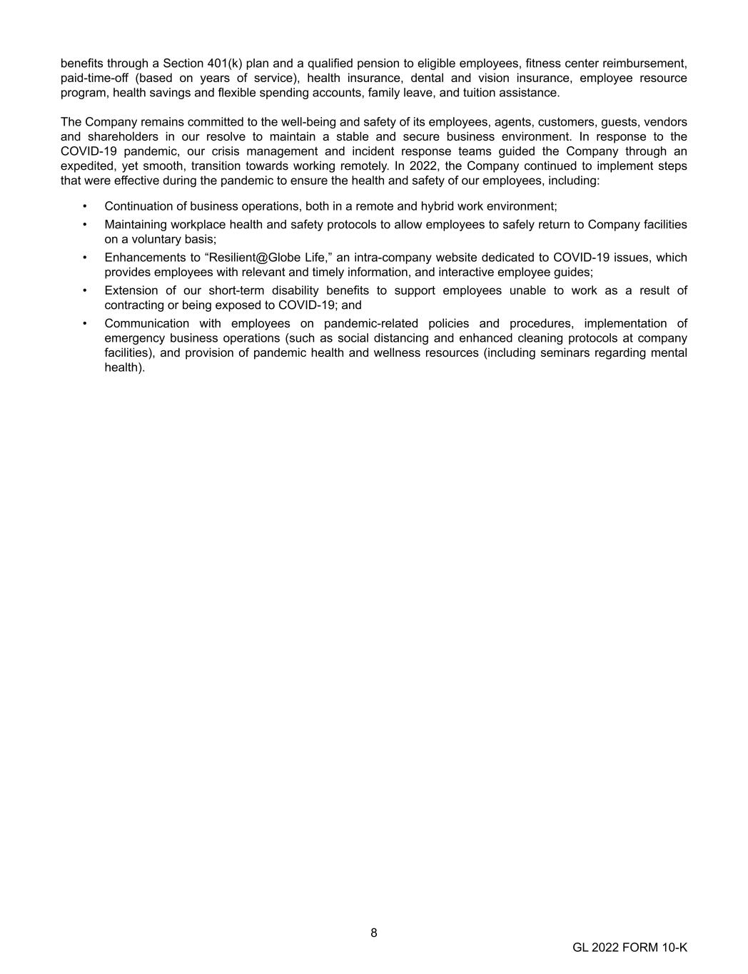 benefits through a Section 401(k) plan and a qualified pension to eligible employees, fitness center reimbursement, paid-time-off (based on years of service), health insurance, dental and vision insurance, employee resource program, health savings and flexible spending accounts, family leave, and tuition assistance. The Company remains committed to the well-being and safety of its employees, agents, customers, guests, vendors and shareholders in our resolve to maintain a stable and secure business environment. In response to the COVID-19 pandemic, our crisis management and incident response teams guided the Company through an expedited, yet smooth, transition towards working remotely. In 2022, the Company continued to implement steps that were effective during the pandemic to ensure the health and safety of our employees, including: • Continuation of business operations, both in a remote and hybrid work environment; • Maintaining workplace health and safety protocols to allow employees to safely return to Company facilities on a voluntary basis; • Enhancements to “Resilient@Globe Life,” an intra-company website dedicated to COVID-19 issues, which provides employees with relevant and timely information, and interactive employee guides; • Extension of our short-term disability benefits to support employees unable to work as a result of contracting or being exposed to COVID-19; and • Communication with employees on pandemic-related policies and procedures, implementation of emergency business operations (such as social distancing and enhanced cleaning protocols at company facilities), and provision of pandemic health and wellness resources (including seminars regarding mental health). 8 GL 2022 FORM 10-K