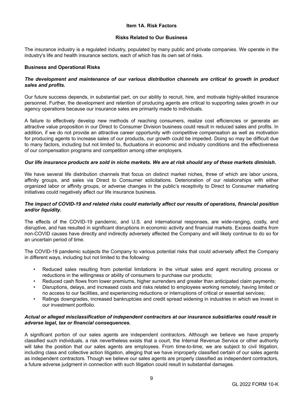 Item 1A. Risk Factors Risks Related to Our Business The insurance industry is a regulated industry, populated by many public and private companies. We operate in the industry's life and health insurance sectors, each of which has its own set of risks. Business and Operational Risks The development and maintenance of our various distribution channels are critical to growth in product sales and profits. Our future success depends, in substantial part, on our ability to recruit, hire, and motivate highly-skilled insurance personnel. Further, the development and retention of producing agents are critical to supporting sales growth in our agency operations because our insurance sales are primarily made to individuals. A failure to effectively develop new methods of reaching consumers, realize cost efficiencies or generate an attractive value proposition in our Direct to Consumer Division business could result in reduced sales and profits. In addition, if we do not provide an attractive career opportunity with competitive compensation as well as motivation for producing agents to increase sales of our products, our growth could be impeded. Doing so may be difficult due to many factors, including but not limited to, fluctuations in economic and industry conditions and the effectiveness of our compensation programs and competition among other employers. Our life insurance products are sold in niche markets. We are at risk should any of these markets diminish. We have several life distribution channels that focus on distinct market niches, three of which are labor unions, affinity groups, and sales via Direct to Consumer solicitations. Deterioration of our relationships with either organized labor or affinity groups, or adverse changes in the public’s receptivity to Direct to Consumer marketing initiatives could negatively affect our life insurance business. The impact of COVID-19 and related risks could materially affect our results of operations, financial position and/or liquidity. The effects of the COVID-19 pandemic, and U.S. and international responses, are wide-ranging, costly, and disruptive, and has resulted in significant disruptions in economic activity and financial markets. Excess deaths from non-COVID causes have directly and indirectly adversely affected the Company and will likely continue to do so for an uncertain period of time. The COVID-19 pandemic subjects the Company to various potential risks that could adversely affect the Company in different ways, including but not limited to the following: • Reduced sales resulting from potential limitations in the virtual sales and agent recruiting process or reductions in the willingness or ability of consumers to purchase our products; • Reduced cash flows from lower premiums, higher surrenders and greater than anticipated claim payments; • Disruptions, delays, and increased costs and risks related to employees working remotely, having limited or no access to our facilities, and experiencing reductions or interruptions of critical or essential services; • Ratings downgrades, increased bankruptcies and credit spread widening in industries in which we invest in our investment portfolio. Actual or alleged misclassification of independent contractors at our insurance subsidiaries could result in adverse legal, tax or financial consequences. A significant portion of our sales agents are independent contractors. Although we believe we have properly classified such individuals, a risk nevertheless exists that a court, the Internal Revenue Service or other authority will take the position that our sales agents are employees. From time-to-time, we are subject to civil litigation, including class and collective action litigation, alleging that we have improperly classified certain of our sales agents as independent contractors. Though we believe our sales agents are properly classified as independent contractors, a future adverse judgment in connection with such litigation could result in substantial damages. 9 GL 2022 FORM 10-K