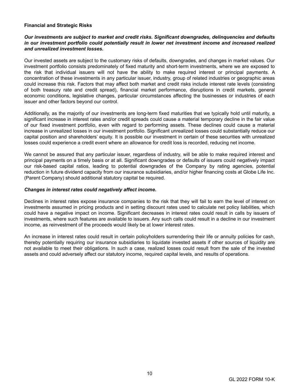 Financial and Strategic Risks Our investments are subject to market and credit risks. Significant downgrades, delinquencies and defaults in our investment portfolio could potentially result in lower net investment income and increased realized and unrealized investment losses. Our invested assets are subject to the customary risks of defaults, downgrades, and changes in market values. Our investment portfolio consists predominately of fixed maturity and short-term investments, where we are exposed to the risk that individual issuers will not have the ability to make required interest or principal payments. A concentration of these investments in any particular issuer, industry, group of related industries or geographic areas could increase this risk. Factors that may affect both market and credit risks include interest rate levels (consisting of both treasury rate and credit spread), financial market performance, disruptions in credit markets, general economic conditions, legislative changes, particular circumstances affecting the businesses or industries of each issuer and other factors beyond our control. Additionally, as the majority of our investments are long-term fixed maturities that we typically hold until maturity, a significant increase in interest rates and/or credit spreads could cause a material temporary decline in the fair value of our fixed investment portfolio, even with regard to performing assets. These declines could cause a material increase in unrealized losses in our investment portfolio. Significant unrealized losses could substantially reduce our capital position and shareholders’ equity. It is possible our investment in certain of these securities with unrealized losses could experience a credit event where an allowance for credit loss is recorded, reducing net income. We cannot be assured that any particular issuer, regardless of industry, will be able to make required interest and principal payments on a timely basis or at all. Significant downgrades or defaults of issuers could negatively impact our risk-based capital ratios, leading to potential downgrades of the Company by rating agencies, potential reduction in future dividend capacity from our insurance subsidiaries, and/or higher financing costs at Globe Life Inc. (Parent Company) should additional statutory capital be required. Changes in interest rates could negatively affect income. Declines in interest rates expose insurance companies to the risk that they will fail to earn the level of interest on investments assumed in pricing products and in setting discount rates used to calculate net policy liabilities, which could have a negative impact on income. Significant decreases in interest rates could result in calls by issuers of investments, where such features are available to issuers. Any such calls could result in a decline in our investment income, as reinvestment of the proceeds would likely be at lower interest rates. An increase in interest rates could result in certain policyholders surrendering their life or annuity policies for cash, thereby potentially requiring our insurance subsidiaries to liquidate invested assets if other sources of liquidity are not available to meet their obligations. In such a case, realized losses could result from the sale of the invested assets and could adversely affect our statutory income, required capital levels, and results of operations. 10 GL 2022 FORM 10-K