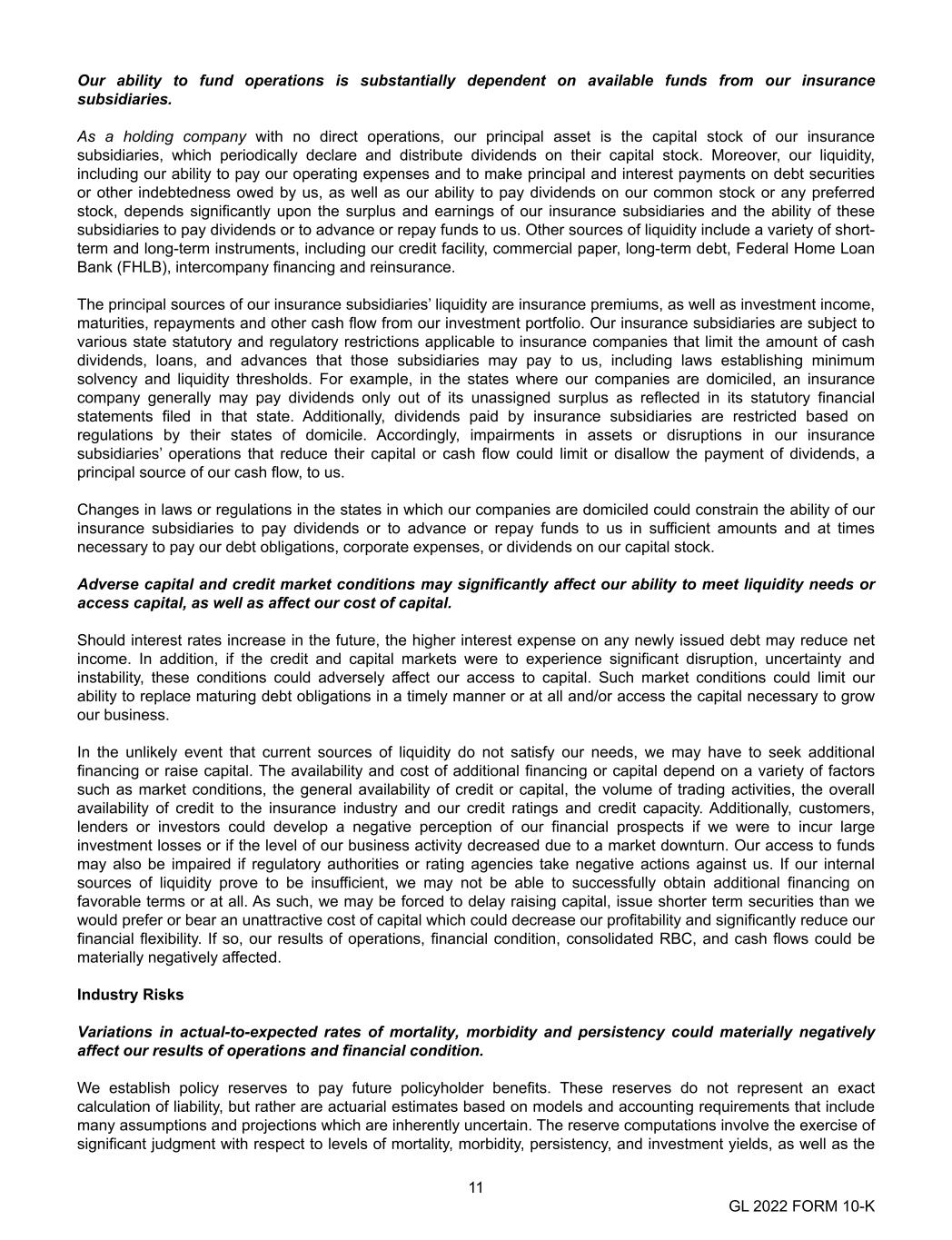 Our ability to fund operations is substantially dependent on available funds from our insurance subsidiaries. As a holding company with no direct operations, our principal asset is the capital stock of our insurance subsidiaries, which periodically declare and distribute dividends on their capital stock. Moreover, our liquidity, including our ability to pay our operating expenses and to make principal and interest payments on debt securities or other indebtedness owed by us, as well as our ability to pay dividends on our common stock or any preferred stock, depends significantly upon the surplus and earnings of our insurance subsidiaries and the ability of these subsidiaries to pay dividends or to advance or repay funds to us. Other sources of liquidity include a variety of short- term and long-term instruments, including our credit facility, commercial paper, long-term debt, Federal Home Loan Bank (FHLB), intercompany financing and reinsurance. The principal sources of our insurance subsidiaries’ liquidity are insurance premiums, as well as investment income, maturities, repayments and other cash flow from our investment portfolio. Our insurance subsidiaries are subject to various state statutory and regulatory restrictions applicable to insurance companies that limit the amount of cash dividends, loans, and advances that those subsidiaries may pay to us, including laws establishing minimum solvency and liquidity thresholds. For example, in the states where our companies are domiciled, an insurance company generally may pay dividends only out of its unassigned surplus as reflected in its statutory financial statements filed in that state. Additionally, dividends paid by insurance subsidiaries are restricted based on regulations by their states of domicile. Accordingly, impairments in assets or disruptions in our insurance subsidiaries’ operations that reduce their capital or cash flow could limit or disallow the payment of dividends, a principal source of our cash flow, to us. Changes in laws or regulations in the states in which our companies are domiciled could constrain the ability of our insurance subsidiaries to pay dividends or to advance or repay funds to us in sufficient amounts and at times necessary to pay our debt obligations, corporate expenses, or dividends on our capital stock. Adverse capital and credit market conditions may significantly affect our ability to meet liquidity needs or access capital, as well as affect our cost of capital. Should interest rates increase in the future, the higher interest expense on any newly issued debt may reduce net income. In addition, if the credit and capital markets were to experience significant disruption, uncertainty and instability, these conditions could adversely affect our access to capital. Such market conditions could limit our ability to replace maturing debt obligations in a timely manner or at all and/or access the capital necessary to grow our business. In the unlikely event that current sources of liquidity do not satisfy our needs, we may have to seek additional financing or raise capital. The availability and cost of additional financing or capital depend on a variety of factors such as market conditions, the general availability of credit or capital, the volume of trading activities, the overall availability of credit to the insurance industry and our credit ratings and credit capacity. Additionally, customers, lenders or investors could develop a negative perception of our financial prospects if we were to incur large investment losses or if the level of our business activity decreased due to a market downturn. Our access to funds may also be impaired if regulatory authorities or rating agencies take negative actions against us. If our internal sources of liquidity prove to be insufficient, we may not be able to successfully obtain additional financing on favorable terms or at all. As such, we may be forced to delay raising capital, issue shorter term securities than we would prefer or bear an unattractive cost of capital which could decrease our profitability and significantly reduce our financial flexibility. If so, our results of operations, financial condition, consolidated RBC, and cash flows could be materially negatively affected. Industry Risks Variations in actual-to-expected rates of mortality, morbidity and persistency could materially negatively affect our results of operations and financial condition. We establish policy reserves to pay future policyholder benefits. These reserves do not represent an exact calculation of liability, but rather are actuarial estimates based on models and accounting requirements that include many assumptions and projections which are inherently uncertain. The reserve computations involve the exercise of significant judgment with respect to levels of mortality, morbidity, persistency, and investment yields, as well as the 11 GL 2022 FORM 10-K
