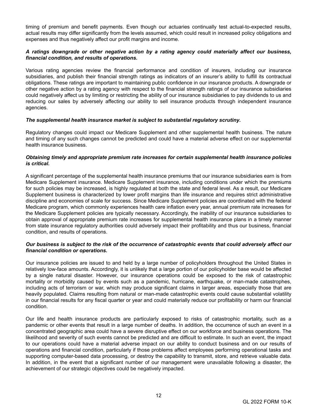 timing of premium and benefit payments. Even though our actuaries continually test actual-to-expected results, actual results may differ significantly from the levels assumed, which could result in increased policy obligations and expenses and thus negatively affect our profit margins and income. A ratings downgrade or other negative action by a rating agency could materially affect our business, financial condition, and results of operations. Various rating agencies review the financial performance and condition of insurers, including our insurance subsidiaries, and publish their financial strength ratings as indicators of an insurer’s ability to fulfill its contractual obligations. These ratings are important to maintaining public confidence in our insurance products. A downgrade or other negative action by a rating agency with respect to the financial strength ratings of our insurance subsidiaries could negatively affect us by limiting or restricting the ability of our insurance subsidiaries to pay dividends to us and reducing our sales by adversely affecting our ability to sell insurance products through independent insurance agencies. The supplemental health insurance market is subject to substantial regulatory scrutiny. Regulatory changes could impact our Medicare Supplement and other supplemental health business. The nature and timing of any such changes cannot be predicted and could have a material adverse effect on our supplemental health insurance business. Obtaining timely and appropriate premium rate increases for certain supplemental health insurance policies is critical. A significant percentage of the supplemental health insurance premiums that our insurance subsidiaries earn is from Medicare Supplement insurance. Medicare Supplement insurance, including conditions under which the premiums for such policies may be increased, is highly regulated at both the state and federal level. As a result, our Medicare Supplement business is characterized by lower profit margins than life insurance and requires strict administrative discipline and economies of scale for success. Since Medicare Supplement policies are coordinated with the federal Medicare program, which commonly experiences health care inflation every year, annual premium rate increases for the Medicare Supplement policies are typically necessary. Accordingly, the inability of our insurance subsidiaries to obtain approval of appropriate premium rate increases for supplemental health insurance plans in a timely manner from state insurance regulatory authorities could adversely impact their profitability and thus our business, financial condition, and results of operations. Our business is subject to the risk of the occurrence of catastrophic events that could adversely affect our financial condition or operations. Our insurance policies are issued to and held by a large number of policyholders throughout the United States in relatively low-face amounts. Accordingly, it is unlikely that a large portion of our policyholder base would be affected by a single natural disaster. However, our insurance operations could be exposed to the risk of catastrophic mortality or morbidity caused by events such as a pandemic, hurricane, earthquake, or man-made catastrophes, including acts of terrorism or war, which may produce significant claims in larger areas, especially those that are heavily populated. Claims resulting from natural or man-made catastrophic events could cause substantial volatility in our financial results for any fiscal quarter or year and could materially reduce our profitability or harm our financial condition. Our life and health insurance products are particularly exposed to risks of catastrophic mortality, such as a pandemic or other events that result in a large number of deaths. In addition, the occurrence of such an event in a concentrated geographic area could have a severe disruptive effect on our workforce and business operations. The likelihood and severity of such events cannot be predicted and are difficult to estimate. In such an event, the impact to our operations could have a material adverse impact on our ability to conduct business and on our results of operations and financial condition, particularly if those problems affect employees performing operational tasks and supporting computer-based data processing, or destroy the capability to transmit, store, and retrieve valuable data. In addition, in the event that a significant number of our management were unavailable following a disaster, the achievement of our strategic objectives could be negatively impacted. 12 GL 2022 FORM 10-K