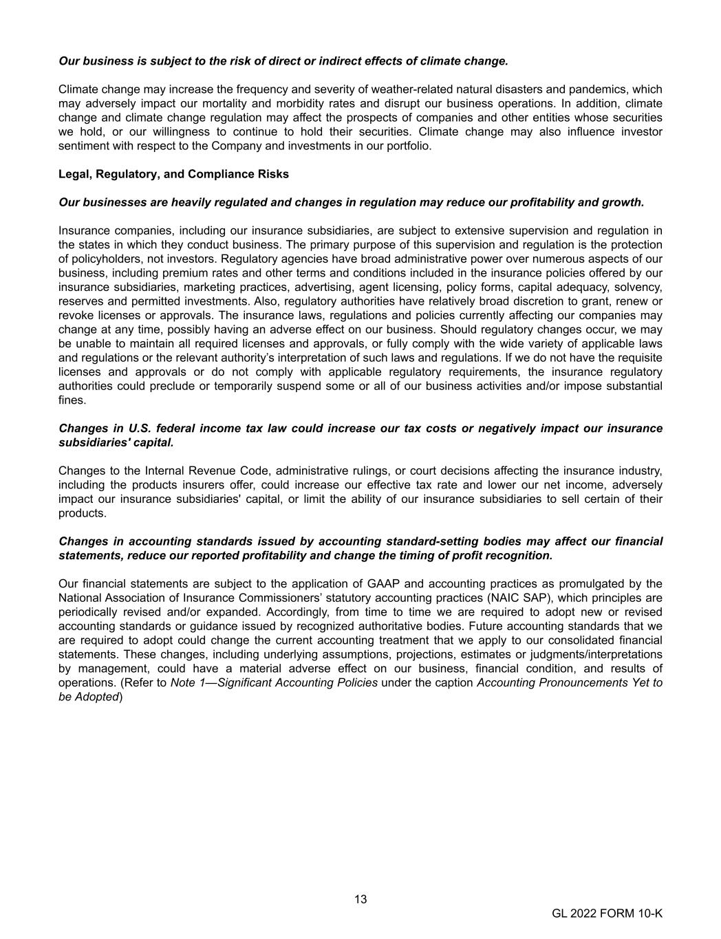Our business is subject to the risk of direct or indirect effects of climate change. Climate change may increase the frequency and severity of weather-related natural disasters and pandemics, which may adversely impact our mortality and morbidity rates and disrupt our business operations. In addition, climate change and climate change regulation may affect the prospects of companies and other entities whose securities we hold, or our willingness to continue to hold their securities. Climate change may also influence investor sentiment with respect to the Company and investments in our portfolio. Legal, Regulatory, and Compliance Risks Our businesses are heavily regulated and changes in regulation may reduce our profitability and growth. Insurance companies, including our insurance subsidiaries, are subject to extensive supervision and regulation in the states in which they conduct business. The primary purpose of this supervision and regulation is the protection of policyholders, not investors. Regulatory agencies have broad administrative power over numerous aspects of our business, including premium rates and other terms and conditions included in the insurance policies offered by our insurance subsidiaries, marketing practices, advertising, agent licensing, policy forms, capital adequacy, solvency, reserves and permitted investments. Also, regulatory authorities have relatively broad discretion to grant, renew or revoke licenses or approvals. The insurance laws, regulations and policies currently affecting our companies may change at any time, possibly having an adverse effect on our business. Should regulatory changes occur, we may be unable to maintain all required licenses and approvals, or fully comply with the wide variety of applicable laws and regulations or the relevant authority’s interpretation of such laws and regulations. If we do not have the requisite licenses and approvals or do not comply with applicable regulatory requirements, the insurance regulatory authorities could preclude or temporarily suspend some or all of our business activities and/or impose substantial fines. Changes in U.S. federal income tax law could increase our tax costs or negatively impact our insurance subsidiaries' capital. Changes to the Internal Revenue Code, administrative rulings, or court decisions affecting the insurance industry, including the products insurers offer, could increase our effective tax rate and lower our net income, adversely impact our insurance subsidiaries' capital, or limit the ability of our insurance subsidiaries to sell certain of their products. Changes in accounting standards issued by accounting standard-setting bodies may affect our financial statements, reduce our reported profitability and change the timing of profit recognition. Our financial statements are subject to the application of GAAP and accounting practices as promulgated by the National Association of Insurance Commissioners’ statutory accounting practices (NAIC SAP), which principles are periodically revised and/or expanded. Accordingly, from time to time we are required to adopt new or revised accounting standards or guidance issued by recognized authoritative bodies. Future accounting standards that we are required to adopt could change the current accounting treatment that we apply to our consolidated financial statements. These changes, including underlying assumptions, projections, estimates or judgments/interpretations by management, could have a material adverse effect on our business, financial condition, and results of operations. (Refer to Note 1—Significant Accounting Policies under the caption Accounting Pronouncements Yet to be Adopted) 13 GL 2022 FORM 10-K