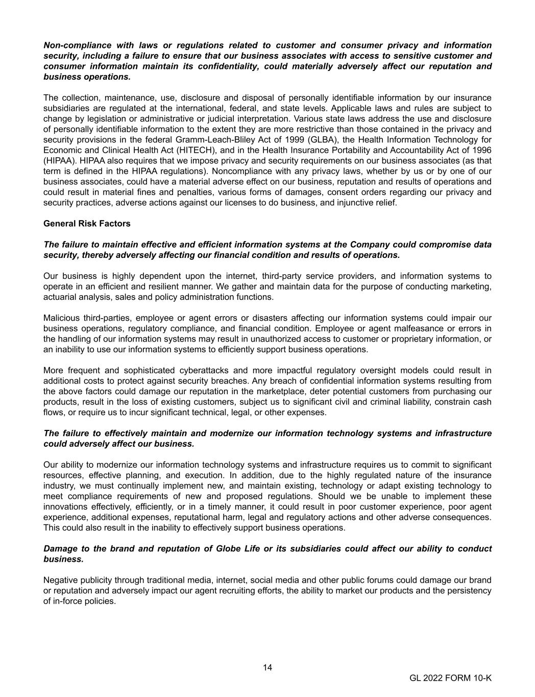 Non-compliance with laws or regulations related to customer and consumer privacy and information security, including a failure to ensure that our business associates with access to sensitive customer and consumer information maintain its confidentiality, could materially adversely affect our reputation and business operations. The collection, maintenance, use, disclosure and disposal of personally identifiable information by our insurance subsidiaries are regulated at the international, federal, and state levels. Applicable laws and rules are subject to change by legislation or administrative or judicial interpretation. Various state laws address the use and disclosure of personally identifiable information to the extent they are more restrictive than those contained in the privacy and security provisions in the federal Gramm-Leach-Bliley Act of 1999 (GLBA), the Health Information Technology for Economic and Clinical Health Act (HITECH), and in the Health Insurance Portability and Accountability Act of 1996 (HIPAA). HIPAA also requires that we impose privacy and security requirements on our business associates (as that term is defined in the HIPAA regulations). Noncompliance with any privacy laws, whether by us or by one of our business associates, could have a material adverse effect on our business, reputation and results of operations and could result in material fines and penalties, various forms of damages, consent orders regarding our privacy and security practices, adverse actions against our licenses to do business, and injunctive relief. General Risk Factors The failure to maintain effective and efficient information systems at the Company could compromise data security, thereby adversely affecting our financial condition and results of operations. Our business is highly dependent upon the internet, third-party service providers, and information systems to operate in an efficient and resilient manner. We gather and maintain data for the purpose of conducting marketing, actuarial analysis, sales and policy administration functions. Malicious third-parties, employee or agent errors or disasters affecting our information systems could impair our business operations, regulatory compliance, and financial condition. Employee or agent malfeasance or errors in the handling of our information systems may result in unauthorized access to customer or proprietary information, or an inability to use our information systems to efficiently support business operations. More frequent and sophisticated cyberattacks and more impactful regulatory oversight models could result in additional costs to protect against security breaches. Any breach of confidential information systems resulting from the above factors could damage our reputation in the marketplace, deter potential customers from purchasing our products, result in the loss of existing customers, subject us to significant civil and criminal liability, constrain cash flows, or require us to incur significant technical, legal, or other expenses. The failure to effectively maintain and modernize our information technology systems and infrastructure could adversely affect our business. Our ability to modernize our information technology systems and infrastructure requires us to commit to significant resources, effective planning, and execution. In addition, due to the highly regulated nature of the insurance industry, we must continually implement new, and maintain existing, technology or adapt existing technology to meet compliance requirements of new and proposed regulations. Should we be unable to implement these innovations effectively, efficiently, or in a timely manner, it could result in poor customer experience, poor agent experience, additional expenses, reputational harm, legal and regulatory actions and other adverse consequences. This could also result in the inability to effectively support business operations. Damage to the brand and reputation of Globe Life or its subsidiaries could affect our ability to conduct business. Negative publicity through traditional media, internet, social media and other public forums could damage our brand or reputation and adversely impact our agent recruiting efforts, the ability to market our products and the persistency of in-force policies. 14 GL 2022 FORM 10-K