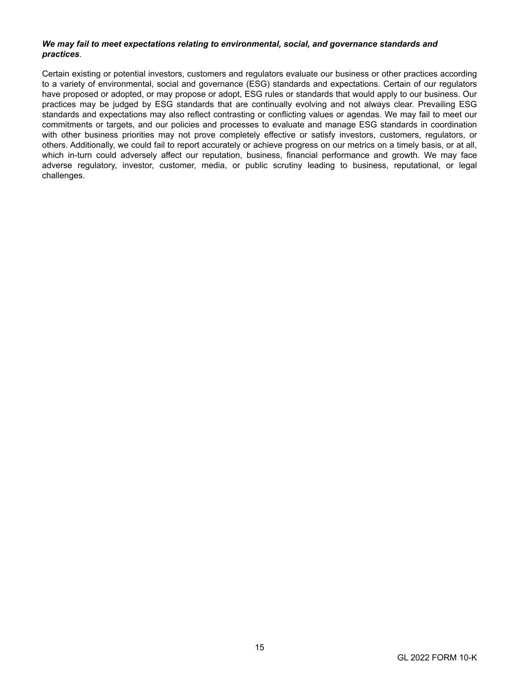 We may fail to meet expectations relating to environmental, social, and governance standards and practices. Certain existing or potential investors, customers and regulators evaluate our business or other practices according to a variety of environmental, social and governance (ESG) standards and expectations. Certain of our regulators have proposed or adopted, or may propose or adopt, ESG rules or standards that would apply to our business. Our practices may be judged by ESG standards that are continually evolving and not always clear. Prevailing ESG standards and expectations may also reflect contrasting or conflicting values or agendas. We may fail to meet our commitments or targets, and our policies and processes to evaluate and manage ESG standards in coordination with other business priorities may not prove completely effective or satisfy investors, customers, regulators, or others. Additionally, we could fail to report accurately or achieve progress on our metrics on a timely basis, or at all, which in-turn could adversely affect our reputation, business, financial performance and growth. We may face adverse regulatory, investor, customer, media, or public scrutiny leading to business, reputational, or legal challenges. 15 GL 2022 FORM 10-K