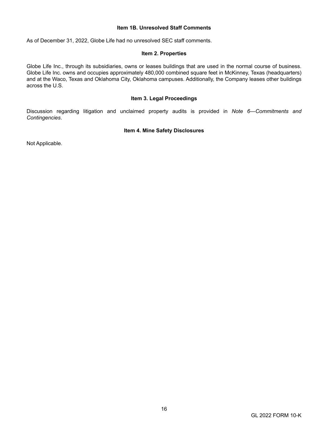 Item 1B. Unresolved Staff Comments As of December 31, 2022, Globe Life had no unresolved SEC staff comments. Item 2. Properties Globe Life Inc., through its subsidiaries, owns or leases buildings that are used in the normal course of business. Globe Life Inc. owns and occupies approximately 480,000 combined square feet in McKinney, Texas (headquarters) and at the Waco, Texas and Oklahoma City, Oklahoma campuses. Additionally, the Company leases other buildings across the U.S. Item 3. Legal Proceedings Discussion regarding litigation and unclaimed property audits is provided in Note 6—Commitments and Contingencies. Item 4. Mine Safety Disclosures Not Applicable. 16 GL 2022 FORM 10-K