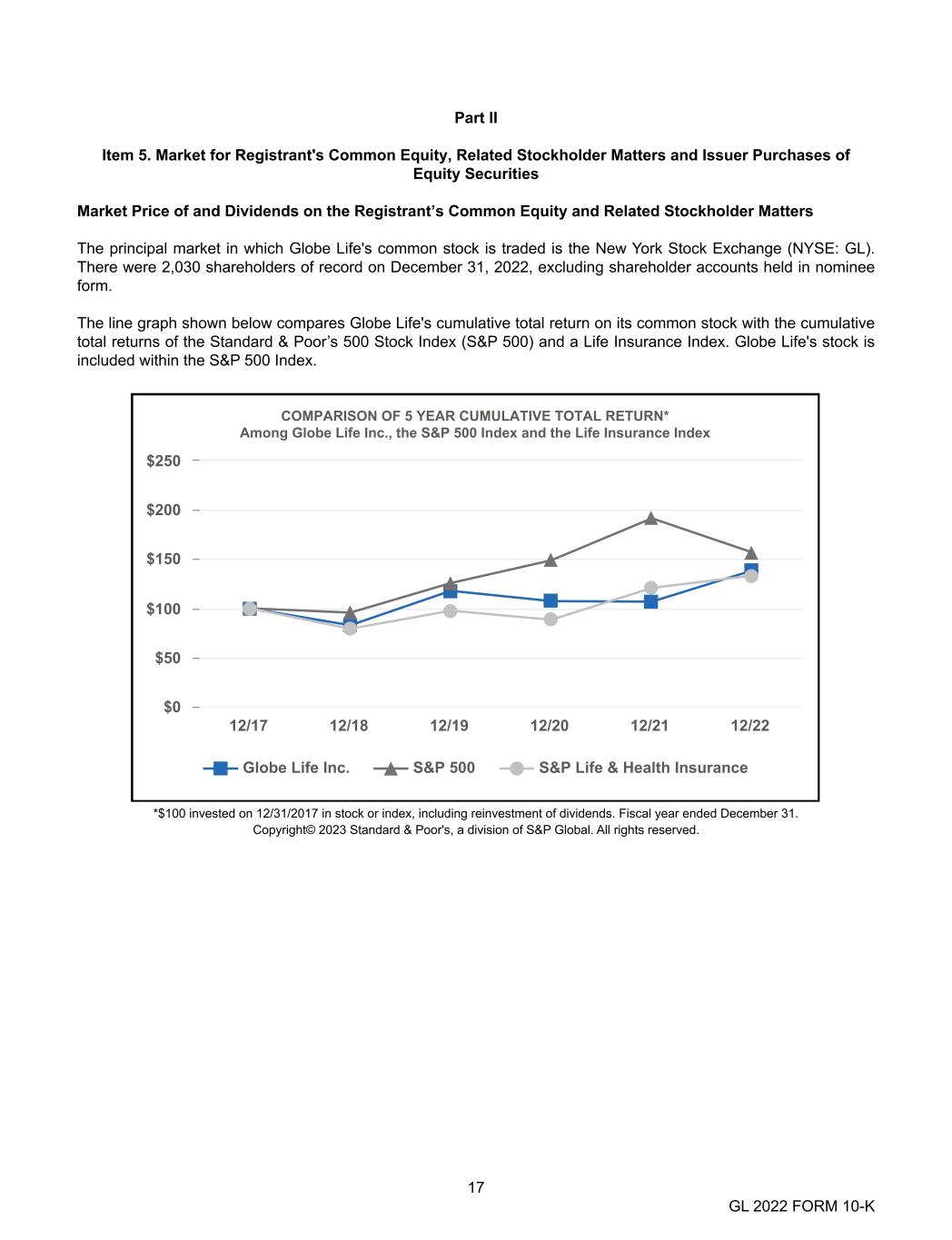 Part II Item 5. Market for Registrant's Common Equity, Related Stockholder Matters and Issuer Purchases of Equity Securities Market Price of and Dividends on the Registrant’s Common Equity and Related Stockholder Matters The principal market in which Globe Life's common stock is traded is the New York Stock Exchange (NYSE: GL). There were 2,030 shareholders of record on December 31, 2022, excluding shareholder accounts held in nominee form. The line graph shown below compares Globe Life's cumulative total return on its common stock with the cumulative total returns of the Standard & Poor’s 500 Stock Index (S&P 500) and a Life Insurance Index. Globe Life's stock is included within the S&P 500 Index. COMPARISON OF 5 YEAR CUMULATIVE TOTAL RETURN* Among Globe Life Inc., the S&P 500 Index and the Life Insurance Index Globe Life Inc. S&P 500 S&P Life & Health Insurance 12/17 12/18 12/19 12/20 12/21 12/22 $0 $50 $100 $150 $200 $250 *$100 invested on 12/31/2017 in stock or index, including reinvestment of dividends. Fiscal year ended December 31. Copyright© 2023 Standard & Poor's, a division of S&P Global. All rights reserved. 17 GL 2022 FORM 10-K