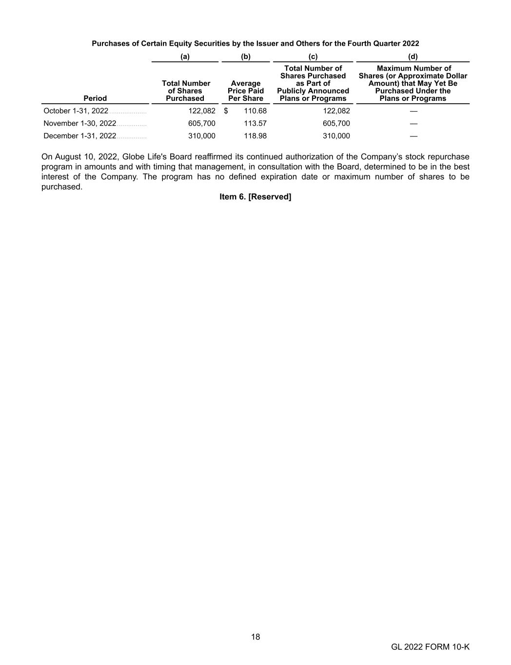 Purchases of Certain Equity Securities by the Issuer and Others for the Fourth Quarter 2022 (a) (b) (c) (d) Period Total Number of Shares Purchased Average Price Paid Per Share Total Number of Shares Purchased as Part of Publicly Announced Plans or Programs Maximum Number of Shares (or Approximate Dollar Amount) that May Yet Be Purchased Under the Plans or Programs October 1-31, 2022 .................... 122,082 $ 110.68 122,082 — November 1-30, 2022................ 605,700 113.57 605,700 — December 1-31, 2022................ 310,000 118.98 310,000 — On August 10, 2022, Globe Life's Board reaffirmed its continued authorization of the Company’s stock repurchase program in amounts and with timing that management, in consultation with the Board, determined to be in the best interest of the Company. The program has no defined expiration date or maximum number of shares to be purchased. Item 6. [Reserved] 18 GL 2022 FORM 10-K