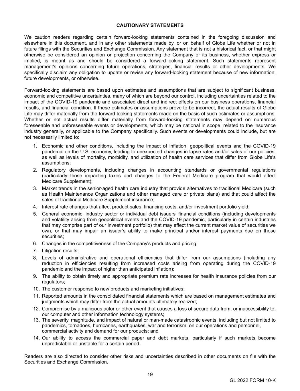CAUTIONARY STATEMENTS We caution readers regarding certain forward-looking statements contained in the foregoing discussion and elsewhere in this document, and in any other statements made by, or on behalf of Globe Life whether or not in future filings with the Securities and Exchange Commission. Any statement that is not a historical fact, or that might otherwise be considered an opinion or projection concerning the Company or its business, whether express or implied, is meant as and should be considered a forward-looking statement. Such statements represent management's opinions concerning future operations, strategies, financial results or other developments. We specifically disclaim any obligation to update or revise any forward-looking statement because of new information, future developments, or otherwise. Forward-looking statements are based upon estimates and assumptions that are subject to significant business, economic and competitive uncertainties, many of which are beyond our control, including uncertainties related to the impact of the COVID-19 pandemic and associated direct and indirect effects on our business operations, financial results, and financial condition. If these estimates or assumptions prove to be incorrect, the actual results of Globe Life may differ materially from the forward-looking statements made on the basis of such estimates or assumptions. Whether or not actual results differ materially from forward-looking statements may depend on numerous foreseeable and unforeseeable events or developments, which may be national in scope, related to the insurance industry generally, or applicable to the Company specifically. Such events or developments could include, but are not necessarily limited to: 1. Economic and other conditions, including the impact of inflation, geopolitical events and the COVID-19 pandemic on the U.S. economy, leading to unexpected changes in lapse rates and/or sales of our policies, as well as levels of mortality, morbidity, and utilization of health care services that differ from Globe Life's assumptions; 2. Regulatory developments, including changes in accounting standards or governmental regulations (particularly those impacting taxes and changes to the Federal Medicare program that would affect Medicare Supplement); 3. Market trends in the senior-aged health care industry that provide alternatives to traditional Medicare (such as Health Maintenance Organizations and other managed care or private plans) and that could affect the sales of traditional Medicare Supplement insurance; 4. Interest rate changes that affect product sales, financing costs, and/or investment portfolio yield; 5. General economic, industry sector or individual debt issuers’ financial conditions (including developments and volatility arising from geopolitical events and the COVID-19 pandemic, particularly in certain industries that may comprise part of our investment portfolio) that may affect the current market value of securities we own, or that may impair an issuer’s ability to make principal and/or interest payments due on those securities; 6. Changes in the competitiveness of the Company's products and pricing; 7. Litigation results; 8. Levels of administrative and operational efficiencies that differ from our assumptions (including any reduction in efficiencies resulting from increased costs arising from operating during the COVID-19 pandemic and the impact of higher than anticipated inflation); 9. The ability to obtain timely and appropriate premium rate increases for health insurance policies from our regulators; 10. The customer response to new products and marketing initiatives; 11. Reported amounts in the consolidated financial statements which are based on management estimates and judgments which may differ from the actual amounts ultimately realized; 12. Compromise by a malicious actor or other event that causes a loss of secure data from, or inaccessibility to, our computer and other information technology systems; 13. The severity, magnitude, and impact of natural or man-made catastrophic events, including but not limited to pandemics, tornadoes, hurricanes, earthquakes, war and terrorism, on our operations and personnel, commercial activity and demand for our products; and 14. Our ability to access the commercial paper and debt markets, particularly if such markets become unpredictable or unstable for a certain period. Readers are also directed to consider other risks and uncertainties described in other documents on file with the Securities and Exchange Commission. 19 GL 2022 FORM 10-K