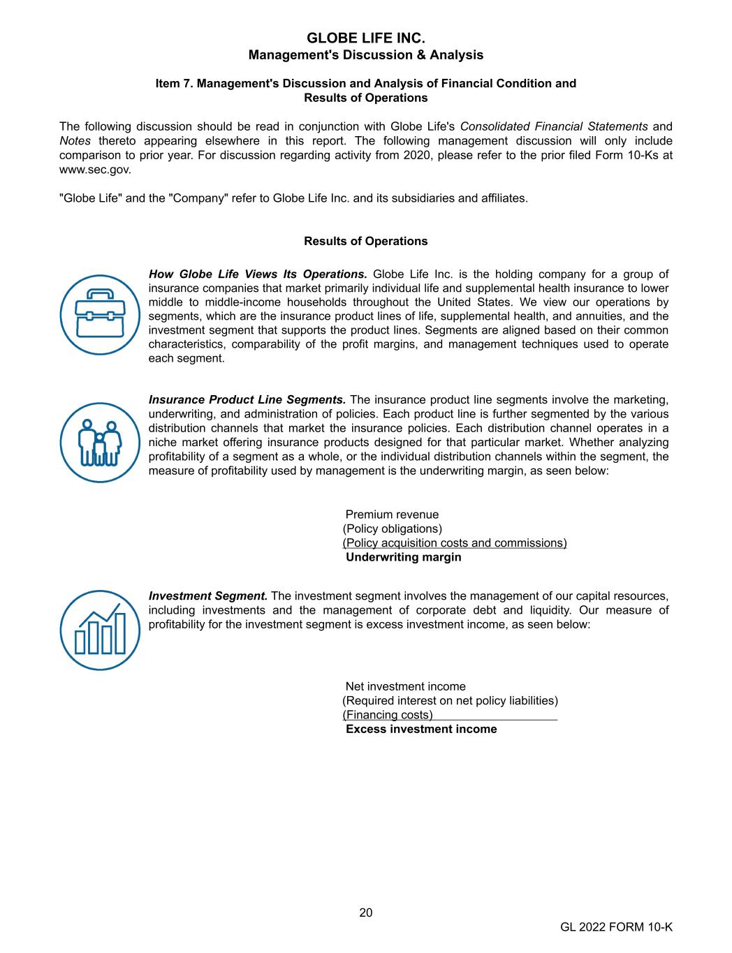 Item 7. Management's Discussion and Analysis of Financial Condition and Results of Operations The following discussion should be read in conjunction with Globe Life's Consolidated Financial Statements and Notes thereto appearing elsewhere in this report. The following management discussion will only include comparison to prior year. For discussion regarding activity from 2020, please refer to the prior filed Form 10-Ks at www.sec.gov. "Globe Life" and the "Company" refer to Globe Life Inc. and its subsidiaries and affiliates. Results of Operations How Globe Life Views Its Operations. Globe Life Inc. is the holding company for a group of insurance companies that market primarily individual life and supplemental health insurance to lower middle to middle-income households throughout the United States. We view our operations by segments, which are the insurance product lines of life, supplemental health, and annuities, and the investment segment that supports the product lines. Segments are aligned based on their common characteristics, comparability of the profit margins, and management techniques used to operate each segment. Insurance Product Line Segments. The insurance product line segments involve the marketing, underwriting, and administration of policies. Each product line is further segmented by the various distribution channels that market the insurance policies. Each distribution channel operates in a niche market offering insurance products designed for that particular market. Whether analyzing profitability of a segment as a whole, or the individual distribution channels within the segment, the measure of profitability used by management is the underwriting margin, as seen below: Premium revenue (Policy obligations) (Policy acquisition costs and commissions) Underwriting margin Investment Segment. The investment segment involves the management of our capital resources, including investments and the management of corporate debt and liquidity. Our measure of profitability for the investment segment is excess investment income, as seen below: Net investment income (Required interest on net policy liabilities) (Financing costs) Excess investment income GLOBE LIFE INC. Management's Discussion & Analysis 20 GL 2022 FORM 10-K