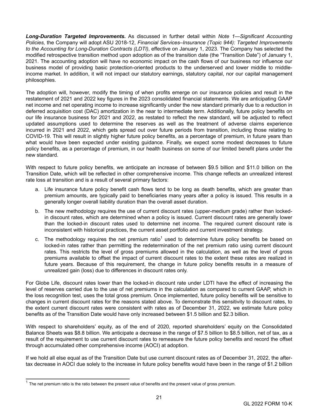 Long-Duration Targeted Improvements. As discussed in further detail within Note 1—Significant Accounting Policies, the Company will adopt ASU 2018-12, Financial Services–Insurance (Topic 944): Targeted Improvements to the Accounting for Long-Duration Contracts (LDTI), effective on January 1, 2023. The Company has selected the modified retrospective transition method upon adoption as of the transition date (the “Transition Date”) of January 1, 2021. The accounting adoption will have no economic impact on the cash flows of our business nor influence our business model of providing basic protection-oriented products to the underserved and lower middle to middle- income market. In addition, it will not impact our statutory earnings, statutory capital, nor our capital management philosophies. The adoption will, however, modify the timing of when profits emerge on our insurance policies and result in the restatement of 2021 and 2022 key figures in the 2023 consolidated financial statements. We are anticipating GAAP net income and net operating income to increase significantly under the new standard primarily due to a reduction in deferred acquisition cost (DAC) amortization in the near to intermediate term. Additionally, future policy benefits on our life insurance business for 2021 and 2022, as restated to reflect the new standard, will be adjusted to reflect updated assumptions used to determine the reserves as well as the treatment of adverse claims experience incurred in 2021 and 2022, which gets spread out over future periods from transition, including those relating to COVID-19. This will result in slightly higher future policy benefits, as a percentage of premium, in future years than what would have been expected under existing guidance. Finally, we expect some modest decreases to future policy benefits, as a percentage of premium, in our health business on some of our limited benefit plans under the new standard. With respect to future policy benefits, we anticipate an increase of between $9.5 billion and $11.0 billion on the Transition Date, which will be reflected in other comprehensive income. This change reflects an unrealized interest rate loss at transition and is a result of several primary factors: a. Life insurance future policy benefit cash flows tend to be long as death benefits, which are greater than premium amounts, are typically paid to beneficiaries many years after a policy is issued. This results in a generally longer overall liability duration than the overall asset duration. b. The new methodology requires the use of current discount rates (upper-medium grade) rather than locked- in discount rates, which are determined when a policy is issued. Current discount rates are generally lower than the locked-in discount rates used to determine net income. The required current discount rate is inconsistent with historical practices, the current asset portfolio and current investment strategy. c. The methodology requires the net premium ratio1 used to determine future policy benefits be based on locked-in rates rather than permitting the redetermination of the net premium ratio using current discount rates. This restricts the level of gross premiums allowed in the calculation, as well as the level of gross premiums available to offset the impact of current discount rates to the extent these rates are realized in future years. Because of this requirement, the change in future policy benefits results in a measure of unrealized gain (loss) due to differences in discount rates only. For Globe Life, discount rates lower than the locked-in discount rate under LDTI have the effect of increasing the level of reserves carried due to the use of net premiums in the calculation as compared to current GAAP, which in the loss recognition test, uses the total gross premium. Once implemented, future policy benefits will be sensitive to changes in current discount rates for the reasons stated above. To demonstrate this sensitivity to discount rates, to the extent current discount rates were consistent with rates as of December 31, 2022, we estimate future policy benefits as of the Transition Date would have only increased between $1.5 billion and $2.3 billion. With respect to shareholders’ equity, as of the end of 2020, reported shareholders’ equity on the Consolidated Balance Sheets was $8.8 billion. We anticipate a decrease in the range of $7.5 billion to $8.5 billion, net of tax, as a result of the requirement to use current discount rates to remeasure the future policy benefits and record the offset through accumulated other comprehensive income (AOCI) at adoption. If we hold all else equal as of the Transition Date but use current discount rates as of December 31, 2022, the after- tax decrease in AOCI due solely to the increase in future policy benefits would have been in the range of $1.2 billion 21 GL 2022 FORM 10-K 1 The net premium ratio is the ratio between the present value of benefits and the present value of gross premium.