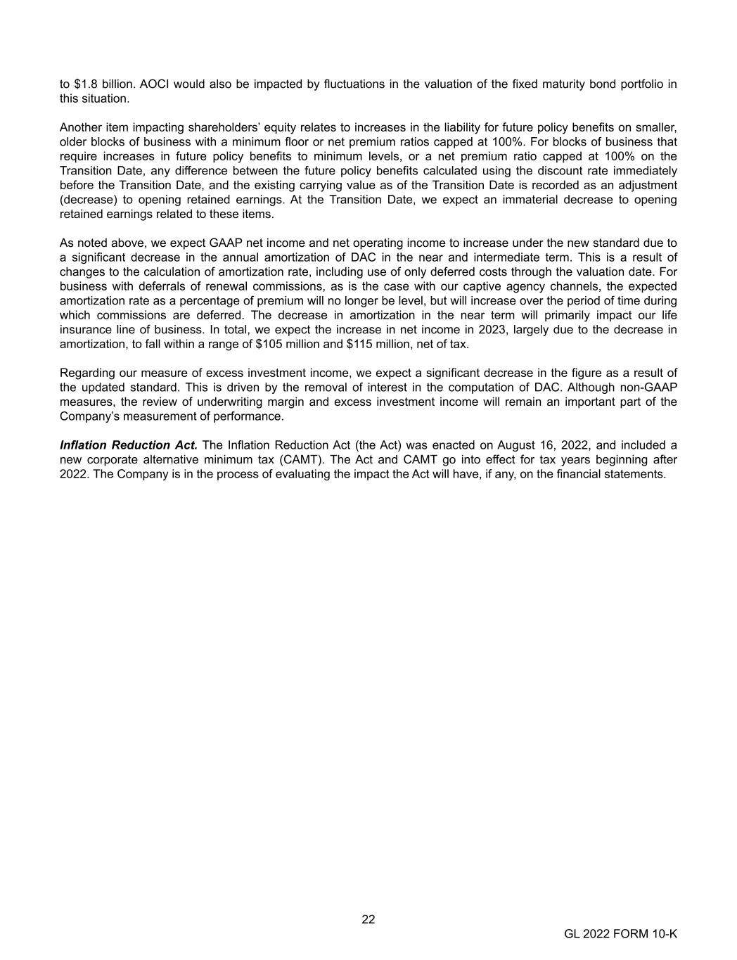 to $1.8 billion. AOCI would also be impacted by fluctuations in the valuation of the fixed maturity bond portfolio in this situation. Another item impacting shareholders’ equity relates to increases in the liability for future policy benefits on smaller, older blocks of business with a minimum floor or net premium ratios capped at 100%. For blocks of business that require increases in future policy benefits to minimum levels, or a net premium ratio capped at 100% on the Transition Date, any difference between the future policy benefits calculated using the discount rate immediately before the Transition Date, and the existing carrying value as of the Transition Date is recorded as an adjustment (decrease) to opening retained earnings. At the Transition Date, we expect an immaterial decrease to opening retained earnings related to these items. As noted above, we expect GAAP net income and net operating income to increase under the new standard due to a significant decrease in the annual amortization of DAC in the near and intermediate term. This is a result of changes to the calculation of amortization rate, including use of only deferred costs through the valuation date. For business with deferrals of renewal commissions, as is the case with our captive agency channels, the expected amortization rate as a percentage of premium will no longer be level, but will increase over the period of time during which commissions are deferred. The decrease in amortization in the near term will primarily impact our life insurance line of business. In total, we expect the increase in net income in 2023, largely due to the decrease in amortization, to fall within a range of $105 million and $115 million, net of tax. Regarding our measure of excess investment income, we expect a significant decrease in the figure as a result of the updated standard. This is driven by the removal of interest in the computation of DAC. Although non-GAAP measures, the review of underwriting margin and excess investment income will remain an important part of the Company’s measurement of performance. Inflation Reduction Act. The Inflation Reduction Act (the Act) was enacted on August 16, 2022, and included a new corporate alternative minimum tax (CAMT). The Act and CAMT go into effect for tax years beginning after 2022. The Company is in the process of evaluating the impact the Act will have, if any, on the financial statements. 22 GL 2022 FORM 10-K