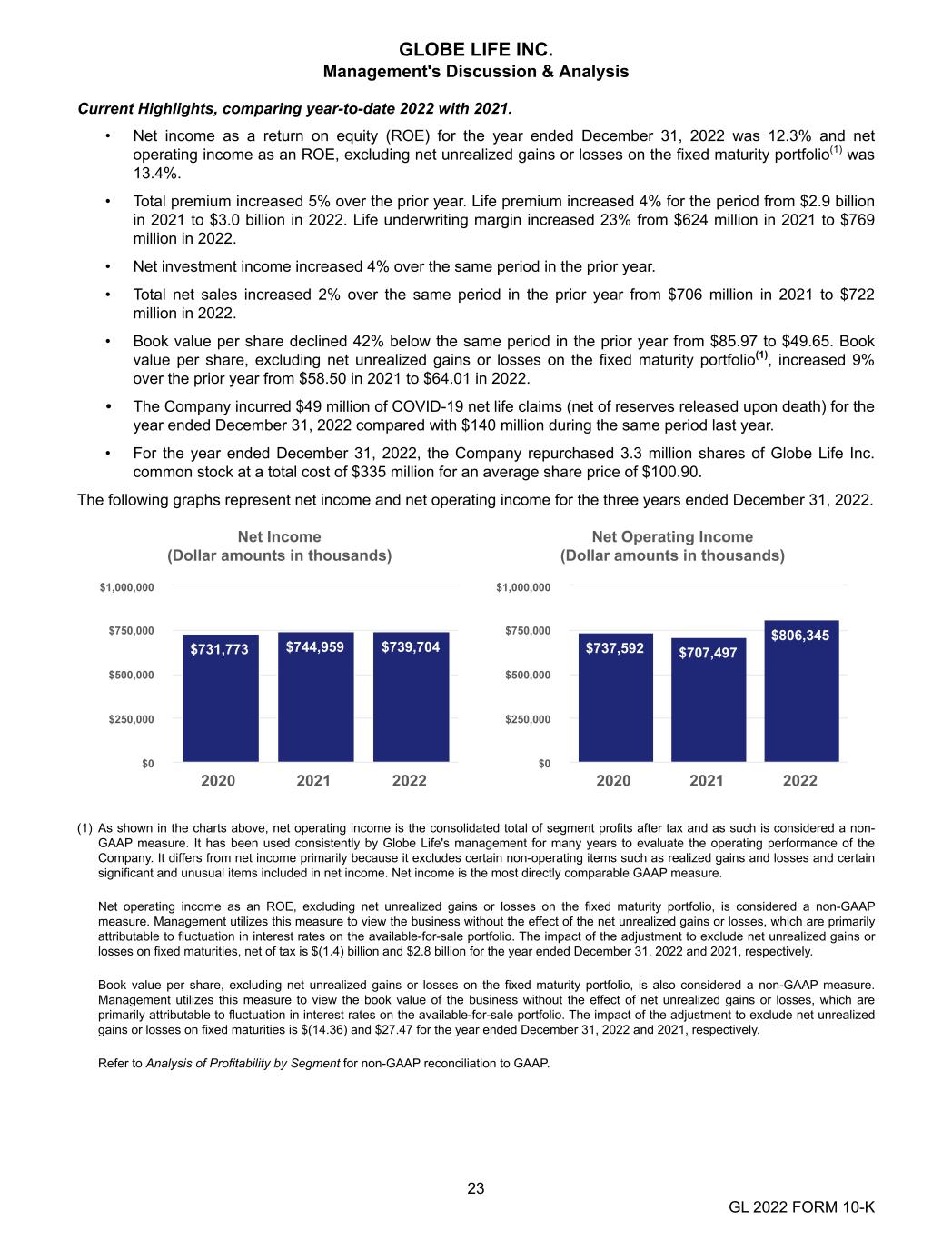 Current Highlights, comparing year-to-date 2022 with 2021. • Net income as a return on equity (ROE) for the year ended December 31, 2022 was 12.3% and net operating income as an ROE, excluding net unrealized gains or losses on the fixed maturity portfolio(1) was 13.4%. • Total premium increased 5% over the prior year. Life premium increased 4% for the period from $2.9 billion in 2021 to $3.0 billion in 2022. Life underwriting margin increased 23% from $624 million in 2021 to $769 million in 2022. • Net investment income increased 4% over the same period in the prior year. • Total net sales increased 2% over the same period in the prior year from $706 million in 2021 to $722 million in 2022. • Book value per share declined 42% below the same period in the prior year from $85.97 to $49.65. Book value per share, excluding net unrealized gains or losses on the fixed maturity portfolio(1), increased 9% over the prior year from $58.50 in 2021 to $64.01 in 2022. • The Company incurred $49 million of COVID-19 net life claims (net of reserves released upon death) for the year ended December 31, 2022 compared with $140 million during the same period last year. • For the year ended December 31, 2022, the Company repurchased 3.3 million shares of Globe Life Inc. common stock at a total cost of $335 million for an average share price of $100.90. The following graphs represent net income and net operating income for the three years ended December 31, 2022. Net Income (Dollar amounts in thousands) $731,773 $744,959 $739,704 2020 2021 2022 $0 $250,000 $500,000 $750,000 $1,000,000 Net Operating Income (Dollar amounts in thousands) $737,592 $707,497 $806,345 2020 2021 2022 $0 $250,000 $500,000 $750,000 $1,000,000 (1) As shown in the charts above, net operating income is the consolidated total of segment profits after tax and as such is considered a non- GAAP measure. It has been used consistently by Globe Life's management for many years to evaluate the operating performance of the Company. It differs from net income primarily because it excludes certain non-operating items such as realized gains and losses and certain significant and unusual items included in net income. Net income is the most directly comparable GAAP measure. Net operating income as an ROE, excluding net unrealized gains or losses on the fixed maturity portfolio, is considered a non-GAAP measure. Management utilizes this measure to view the business without the effect of the net unrealized gains or losses, which are primarily attributable to fluctuation in interest rates on the available-for-sale portfolio. The impact of the adjustment to exclude net unrealized gains or losses on fixed maturities, net of tax is $(1.4) billion and $2.8 billion for the year ended December 31, 2022 and 2021, respectively. Book value per share, excluding net unrealized gains or losses on the fixed maturity portfolio, is also considered a non-GAAP measure. Management utilizes this measure to view the book value of the business without the effect of net unrealized gains or losses, which are primarily attributable to fluctuation in interest rates on the available-for-sale portfolio. The impact of the adjustment to exclude net unrealized gains or losses on fixed maturities is $(14.36) and $27.47 for the year ended December 31, 2022 and 2021, respectively. Refer to Analysis of Profitability by Segment for non-GAAP reconciliation to GAAP. GLOBE LIFE INC. Management's Discussion & Analysis 23 GL 2022 FORM 10-K