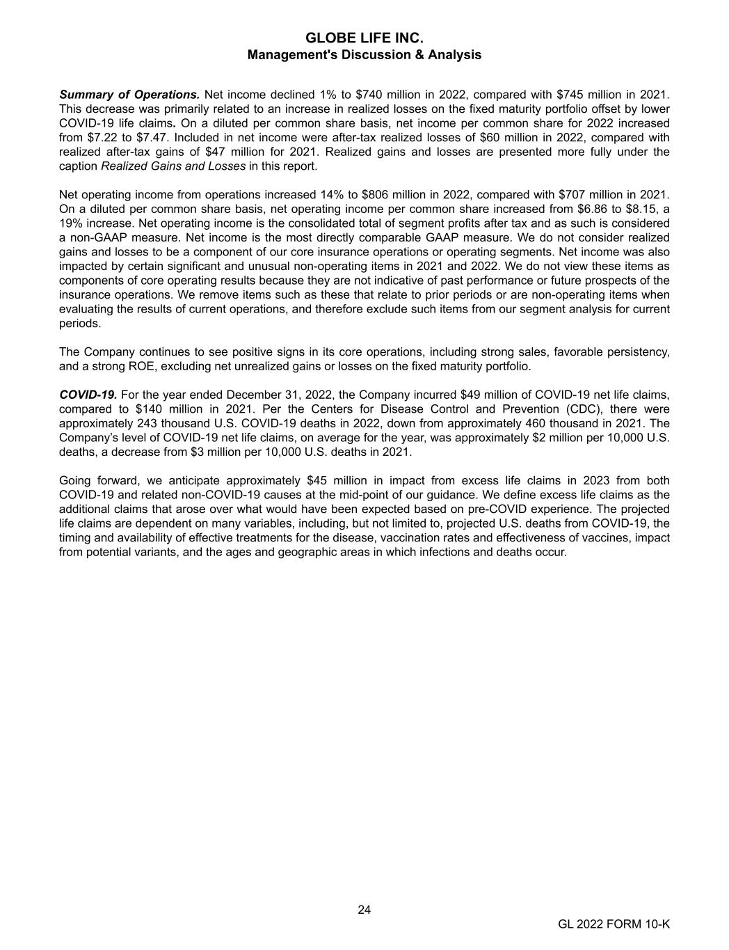 Summary of Operations. Net income declined 1% to $740 million in 2022, compared with $745 million in 2021. This decrease was primarily related to an increase in realized losses on the fixed maturity portfolio offset by lower COVID-19 life claims. On a diluted per common share basis, net income per common share for 2022 increased from $7.22 to $7.47. Included in net income were after-tax realized losses of $60 million in 2022, compared with realized after-tax gains of $47 million for 2021. Realized gains and losses are presented more fully under the caption Realized Gains and Losses in this report. Net operating income from operations increased 14% to $806 million in 2022, compared with $707 million in 2021. On a diluted per common share basis, net operating income per common share increased from $6.86 to $8.15, a 19% increase. Net operating income is the consolidated total of segment profits after tax and as such is considered a non-GAAP measure. Net income is the most directly comparable GAAP measure. We do not consider realized gains and losses to be a component of our core insurance operations or operating segments. Net income was also impacted by certain significant and unusual non-operating items in 2021 and 2022. We do not view these items as components of core operating results because they are not indicative of past performance or future prospects of the insurance operations. We remove items such as these that relate to prior periods or are non-operating items when evaluating the results of current operations, and therefore exclude such items from our segment analysis for current periods. The Company continues to see positive signs in its core operations, including strong sales, favorable persistency, and a strong ROE, excluding net unrealized gains or losses on the fixed maturity portfolio. COVID-19. For the year ended December 31, 2022, the Company incurred $49 million of COVID-19 net life claims, compared to $140 million in 2021. Per the Centers for Disease Control and Prevention (CDC), there were approximately 243 thousand U.S. COVID-19 deaths in 2022, down from approximately 460 thousand in 2021. The Company’s level of COVID-19 net life claims, on average for the year, was approximately $2 million per 10,000 U.S. deaths, a decrease from $3 million per 10,000 U.S. deaths in 2021. Going forward, we anticipate approximately $45 million in impact from excess life claims in 2023 from both COVID-19 and related non-COVID-19 causes at the mid-point of our guidance. We define excess life claims as the additional claims that arose over what would have been expected based on pre-COVID experience. The projected life claims are dependent on many variables, including, but not limited to, projected U.S. deaths from COVID-19, the timing and availability of effective treatments for the disease, vaccination rates and effectiveness of vaccines, impact from potential variants, and the ages and geographic areas in which infections and deaths occur. GLOBE LIFE INC. Management's Discussion & Analysis 24 GL 2022 FORM 10-K