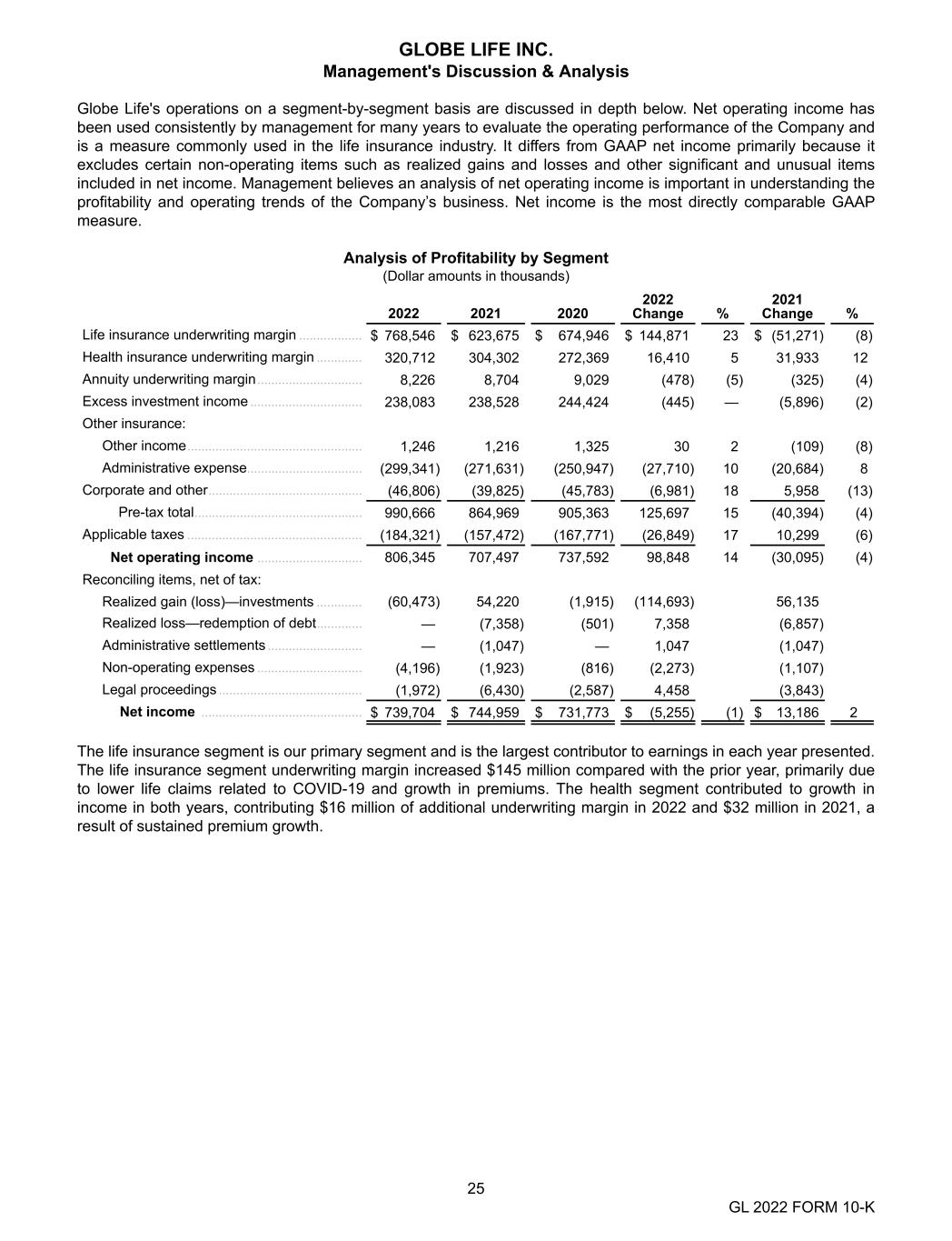 Globe Life's operations on a segment-by-segment basis are discussed in depth below. Net operating income has been used consistently by management for many years to evaluate the operating performance of the Company and is a measure commonly used in the life insurance industry. It differs from GAAP net income primarily because it excludes certain non-operating items such as realized gains and losses and other significant and unusual items included in net income. Management believes an analysis of net operating income is important in understanding the profitability and operating trends of the Company’s business. Net income is the most directly comparable GAAP measure. Analysis of Profitability by Segment (Dollar amounts in thousands) 2022 2021 2020 2022 Change % 2021 Change % Life insurance underwriting margin .................. $ 768,546 $ 623,675 $ 674,946 $ 144,871 23 $ (51,271) (8) Health insurance underwriting margin ............. 320,712 304,302 272,369 16,410 5 31,933 12 Annuity underwriting margin .............................. 8,226 8,704 9,029 (478) (5) (325) (4) Excess investment income ................................ 238,083 238,528 244,424 (445) — (5,896) (2) Other insurance: Other income.................................................. 1,246 1,216 1,325 30 2 (109) (8) Administrative expense................................. (299,341) (271,631) (250,947) (27,710) 10 (20,684) 8 Corporate and other............................................ (46,806) (39,825) (45,783) (6,981) 18 5,958 (13) Pre-tax total................................................ 990,666 864,969 905,363 125,697 15 (40,394) (4) Applicable taxes .................................................. (184,321) (157,472) (167,771) (26,849) 17 10,299 (6) Net operating income .............................. 806,345 707,497 737,592 98,848 14 (30,095) (4) Reconciling items, net of tax: Realized gain (loss)—investments ............. (60,473) 54,220 (1,915) (114,693) 56,135 Realized loss—redemption of debt............. — (7,358) (501) 7,358 (6,857) Administrative settlements ........................... — (1,047) — 1,047 (1,047) Non-operating expenses .............................. (4,196) (1,923) (816) (2,273) (1,107) Legal proceedings ......................................... (1,972) (6,430) (2,587) 4,458 (3,843) Net income .............................................. $ 739,704 $ 744,959 $ 731,773 $ (5,255) (1) $ 13,186 2 The life insurance segment is our primary segment and is the largest contributor to earnings in each year presented. The life insurance segment underwriting margin increased $145 million compared with the prior year, primarily due to lower life claims related to COVID-19 and growth in premiums. The health segment contributed to growth in income in both years, contributing $16 million of additional underwriting margin in 2022 and $32 million in 2021, a result of sustained premium growth. GLOBE LIFE INC. Management's Discussion & Analysis 25 GL 2022 FORM 10-K