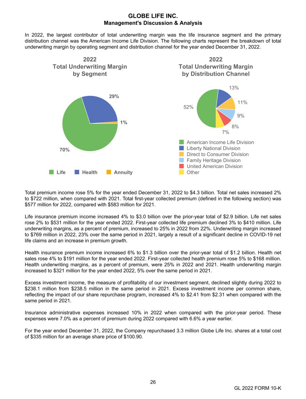 In 2022, the largest contributor of total underwriting margin was the life insurance segment and the primary distribution channel was the American Income Life Division. The following charts represent the breakdown of total underwriting margin by operating segment and distribution channel for the year ended December 31, 2022. 2022 Total Underwriting Margin by Segment 70% 29% 1% Life Health Annuity 2022 Total Underwriting Margin by Distribution Channel 52% 13% 11% 9% 8% 7% American Income Life Division Liberty National Division Direct to Consumer Division Family Heritage Division United American Division Other Total premium income rose 5% for the year ended December 31, 2022 to $4.3 billion. Total net sales increased 2% to $722 million, when compared with 2021. Total first-year collected premium (defined in the following section) was $577 million for 2022, compared with $583 million for 2021. Life insurance premium income increased 4% to $3.0 billion over the prior-year total of $2.9 billion. Life net sales rose 2% to $531 million for the year ended 2022. First-year collected life premium declined 3% to $410 million. Life underwriting margins, as a percent of premium, increased to 25% in 2022 from 22%. Underwriting margin increased to $769 million in 2022, 23% over the same period in 2021, largely a result of a significant decline in COVID-19 net life claims and an increase in premium growth. Health insurance premium income increased 6% to $1.3 billion over the prior-year total of $1.2 billion. Health net sales rose 4% to $191 million for the year ended 2022. First-year collected health premium rose 5% to $168 million. Health underwriting margins, as a percent of premium, were 25% in 2022 and 2021. Health underwriting margin increased to $321 million for the year ended 2022, 5% over the same period in 2021. Excess investment income, the measure of profitability of our investment segment, declined slightly during 2022 to $238.1 million from $238.5 million in the same period in 2021. Excess investment income per common share, reflecting the impact of our share repurchase program, increased 4% to $2.41 from $2.31 when compared with the same period in 2021. Insurance administrative expenses increased 10% in 2022 when compared with the prior-year period. These expenses were 7.0% as a percent of premium during 2022 compared with 6.6% a year earlier. For the year ended December 31, 2022, the Company repurchased 3.3 million Globe Life Inc. shares at a total cost of $335 million for an average share price of $100.90. GLOBE LIFE INC. Management's Discussion & Analysis 26 GL 2022 FORM 10-K