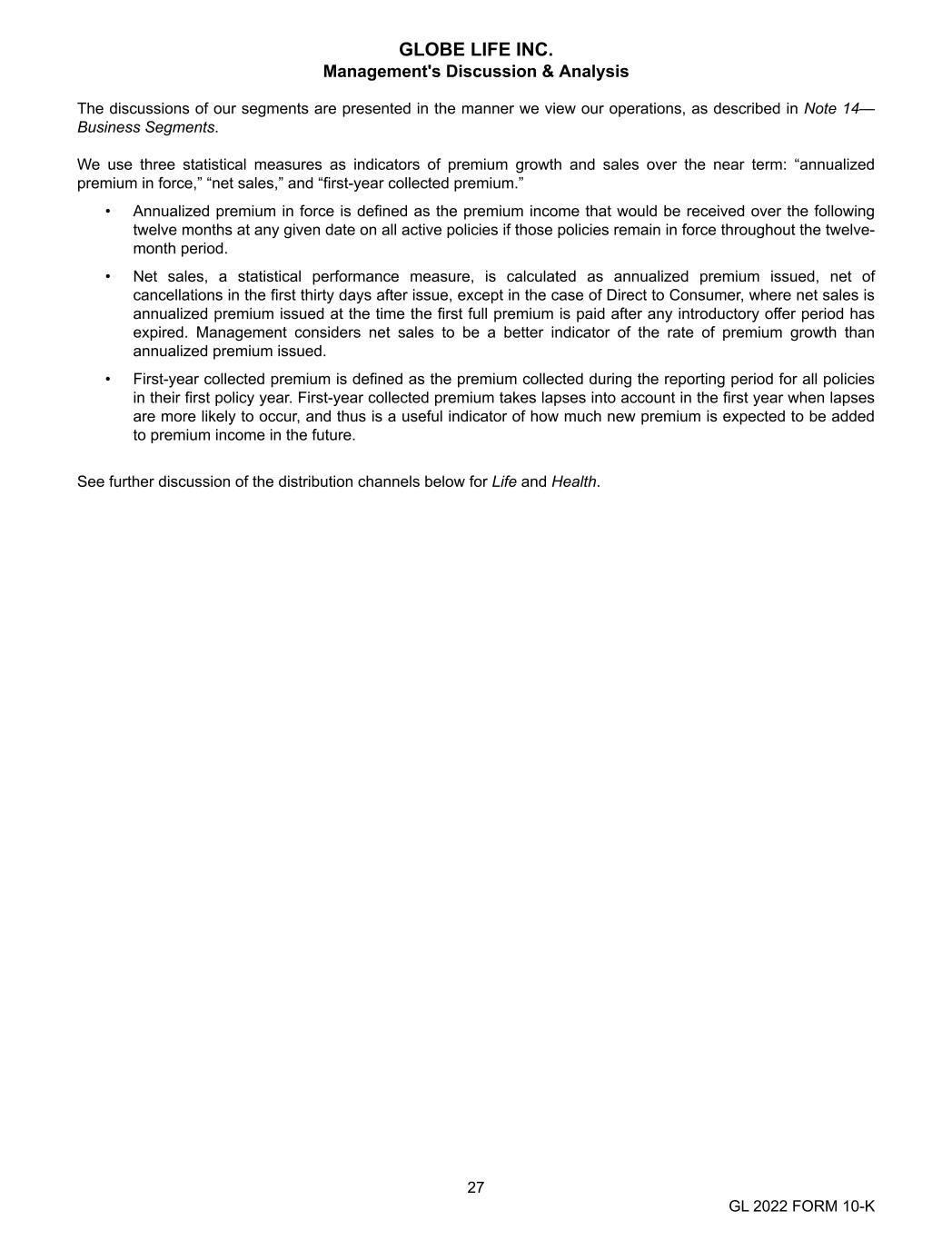 The discussions of our segments are presented in the manner we view our operations, as described in Note 14— Business Segments. We use three statistical measures as indicators of premium growth and sales over the near term: “annualized premium in force,” “net sales,” and “first-year collected premium.” • Annualized premium in force is defined as the premium income that would be received over the following twelve months at any given date on all active policies if those policies remain in force throughout the twelve- month period. • Net sales, a statistical performance measure, is calculated as annualized premium issued, net of cancellations in the first thirty days after issue, except in the case of Direct to Consumer, where net sales is annualized premium issued at the time the first full premium is paid after any introductory offer period has expired. Management considers net sales to be a better indicator of the rate of premium growth than annualized premium issued. • First-year collected premium is defined as the premium collected during the reporting period for all policies in their first policy year. First-year collected premium takes lapses into account in the first year when lapses are more likely to occur, and thus is a useful indicator of how much new premium is expected to be added to premium income in the future. See further discussion of the distribution channels below for Life and Health. GLOBE LIFE INC. Management's Discussion & Analysis 27 GL 2022 FORM 10-K