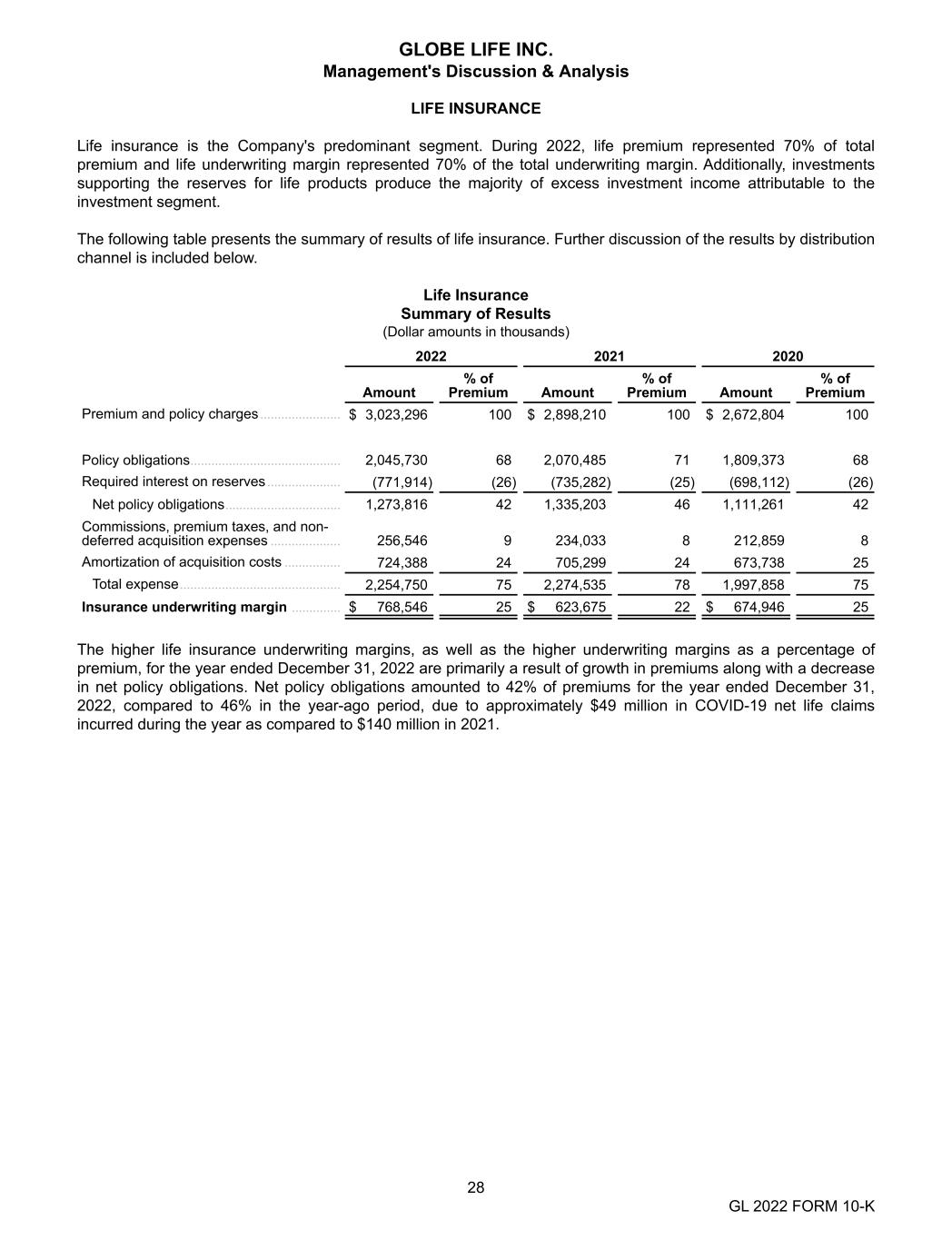 LIFE INSURANCE Life insurance is the Company's predominant segment. During 2022, life premium represented 70% of total premium and life underwriting margin represented 70% of the total underwriting margin. Additionally, investments supporting the reserves for life products produce the majority of excess investment income attributable to the investment segment. The following table presents the summary of results of life insurance. Further discussion of the results by distribution channel is included below. Life Insurance Summary of Results (Dollar amounts in thousands) 2022 2021 2020 Amount % of Premium Amount % of Premium Amount % of Premium Premium and policy charges ....................... $ 3,023,296 100 $ 2,898,210 100 $ 2,672,804 100 Policy obligations........................................... 2,045,730 68 2,070,485 71 1,809,373 68 Required interest on reserves ..................... (771,914) (26) (735,282) (25) (698,112) (26) Net policy obligations................................. 1,273,816 42 1,335,203 46 1,111,261 42 Commissions, premium taxes, and non- deferred acquisition expenses .................... 256,546 9 234,033 8 212,859 8 Amortization of acquisition costs ................ 724,388 24 705,299 24 673,738 25 Total expense.............................................. 2,254,750 75 2,274,535 78 1,997,858 75 Insurance underwriting margin .............. $ 768,546 25 $ 623,675 22 $ 674,946 25 The higher life insurance underwriting margins, as well as the higher underwriting margins as a percentage of premium, for the year ended December 31, 2022 are primarily a result of growth in premiums along with a decrease in net policy obligations. Net policy obligations amounted to 42% of premiums for the year ended December 31, 2022, compared to 46% in the year-ago period, due to approximately $49 million in COVID-19 net life claims incurred during the year as compared to $140 million in 2021. GLOBE LIFE INC. Management's Discussion & Analysis 28 GL 2022 FORM 10-K